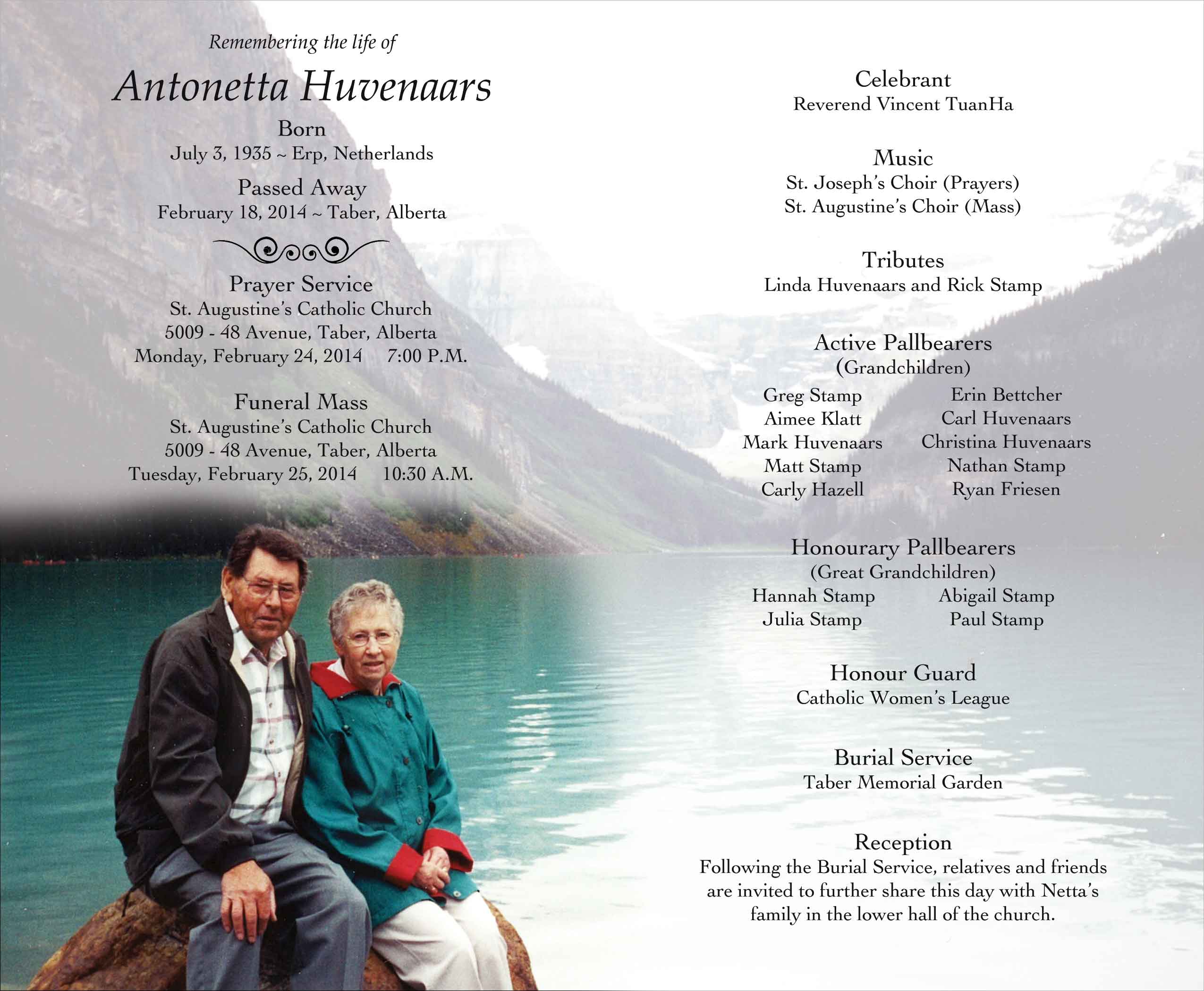 Antonetta Huvenaars, beloved wife of Peter Huvenaars, passed away unexpectedly in Taber on Tuesday, February 18, 2014 at the age of 78 years.