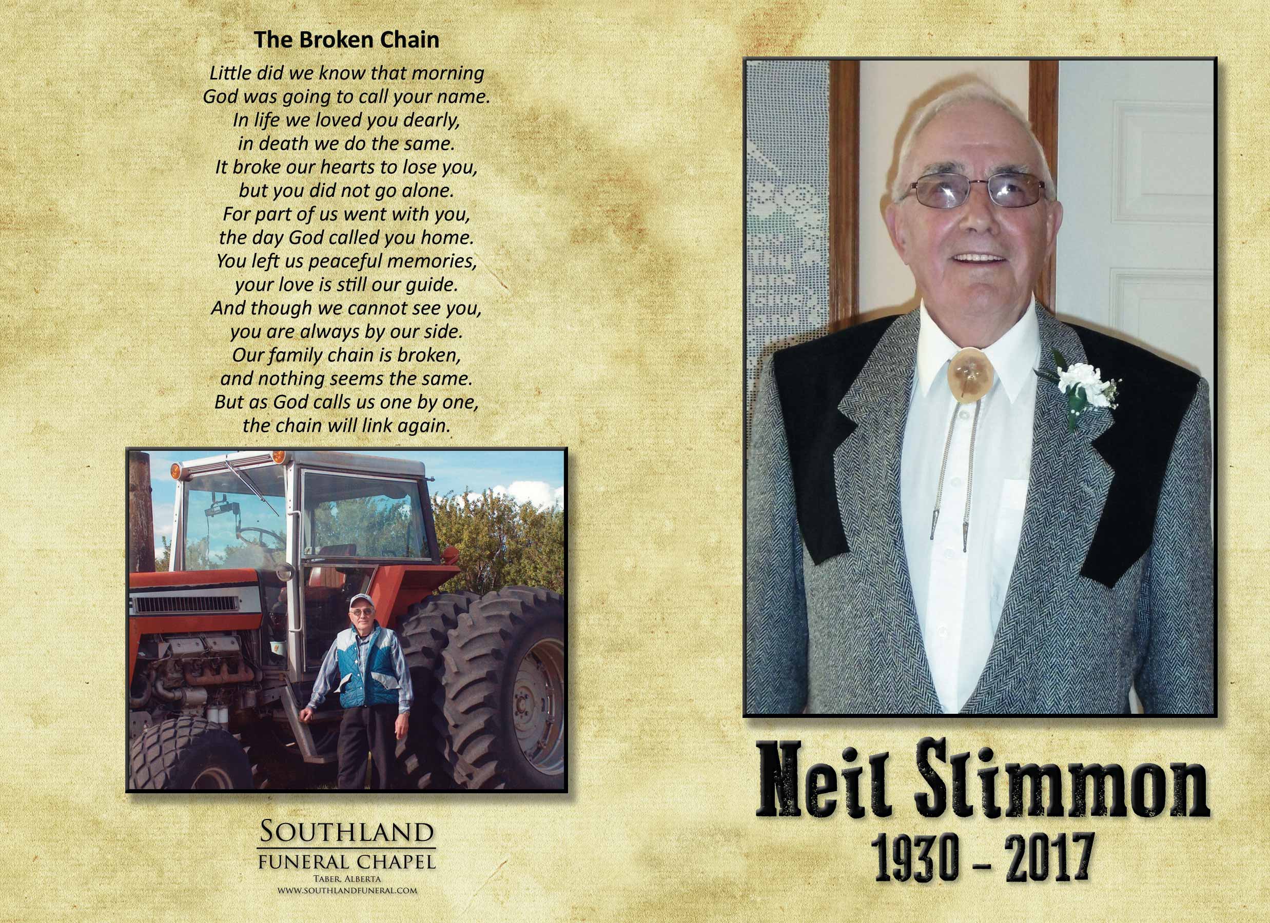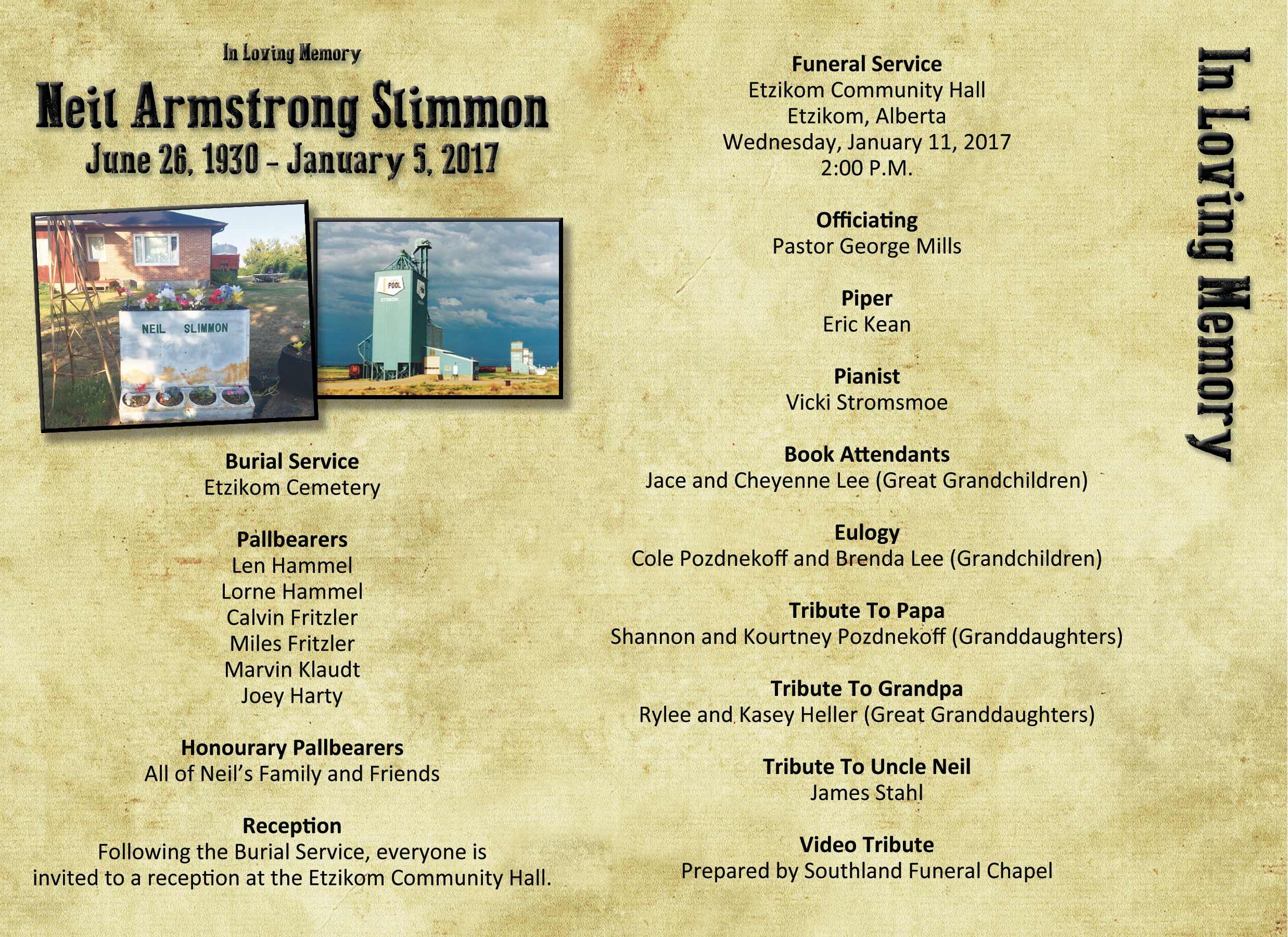 Neil Armstrong Slimmon, beloved husband of the late Ethel Slimmon, passed away peacefully at home near Etzikom on Thursday, January 5, 2017 at the age of 86 years.