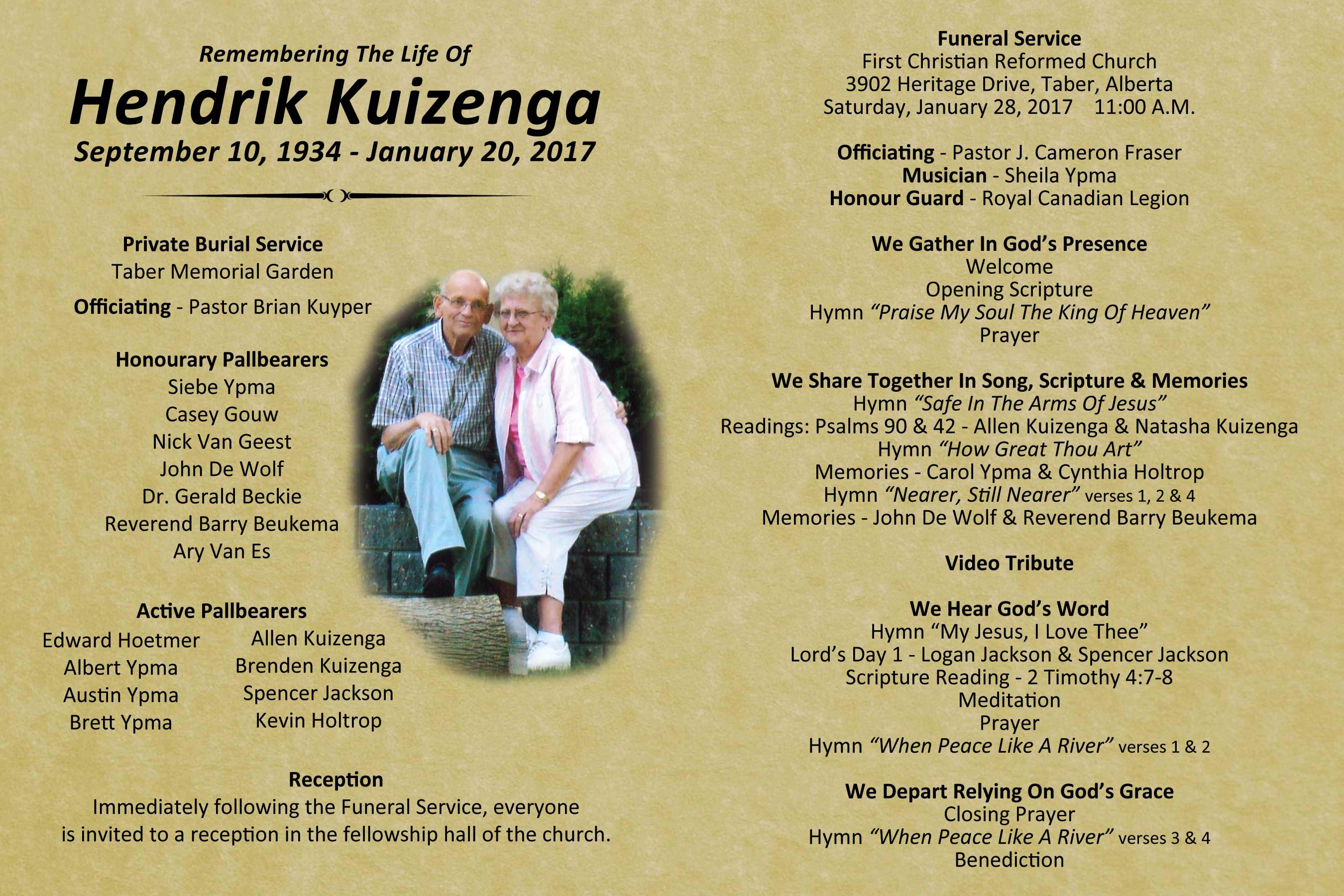 Hendrik Kuizenga, beloved husband of Rose Kuizenga, went home to be with his Lord and Saviour on Friday, January 20, 2017 at the age of 82 years.