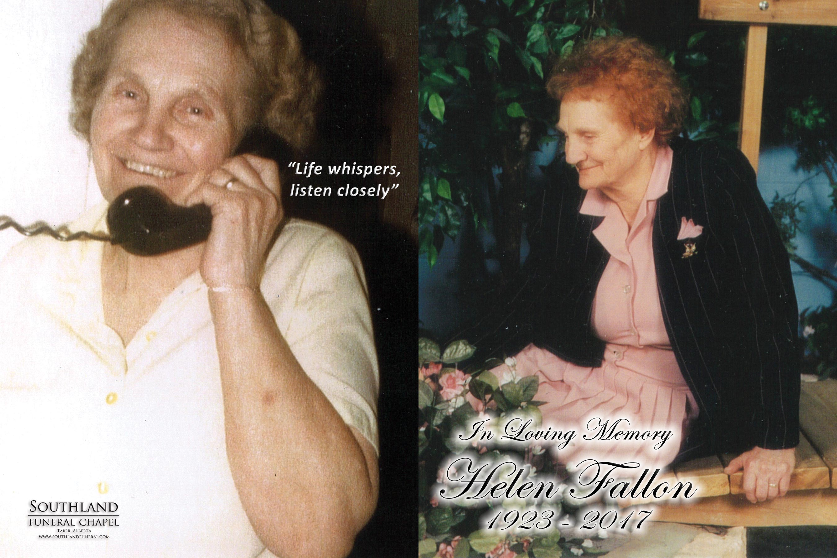 It is with sadness that the family of Helen Marion Fallon, beloved wife of the late Bud Fallon, announce her passing in Lethbridge on Wednesday, January 25, 2017 at the age of 93 years.