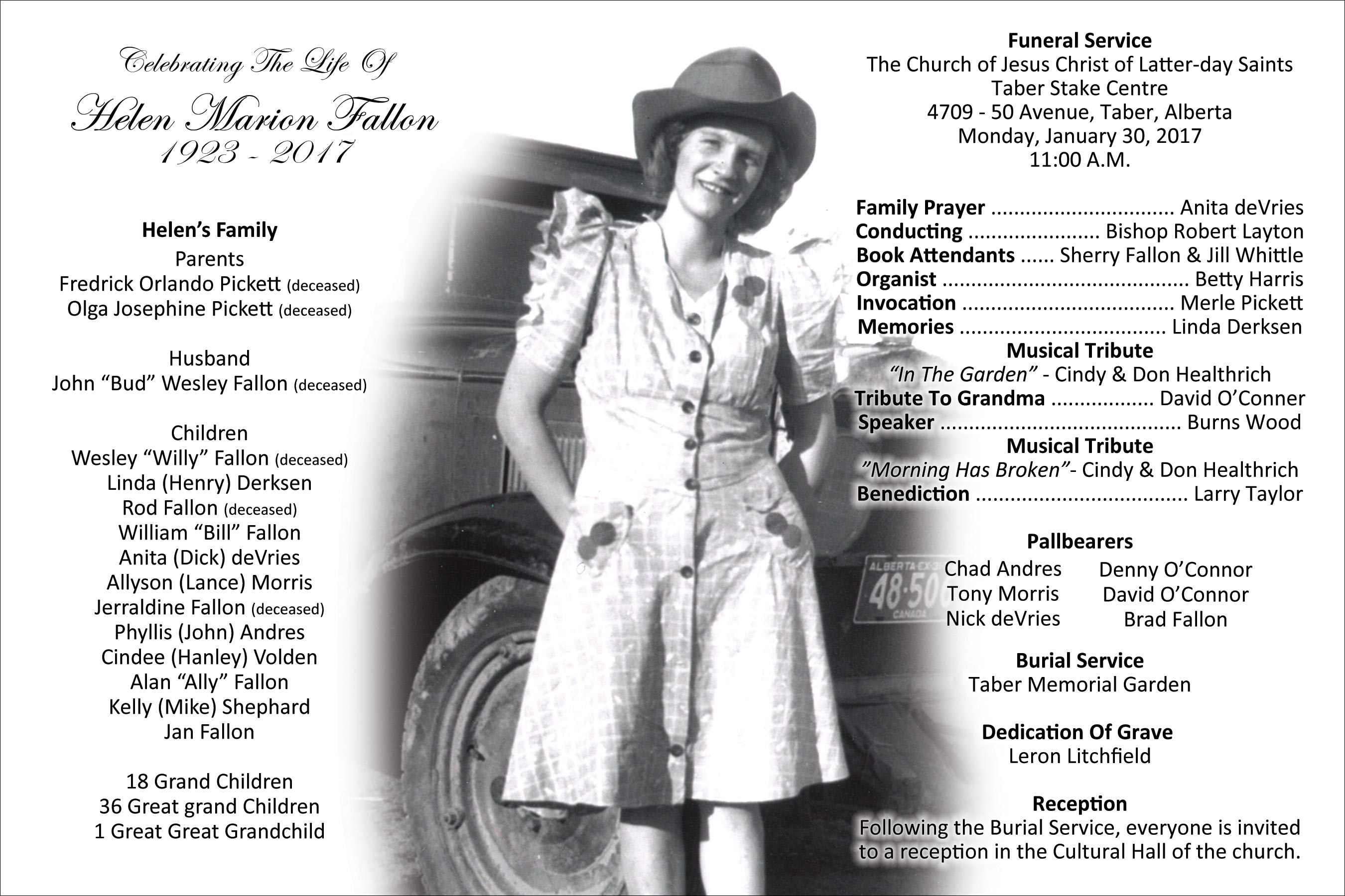 Left behind to remember and celebrate her life are her children Linda (Henry) Derksen of Strathmore, Bill Fallon of Raymond, Anita (Dick) deVries of Enchant, Allyson (Lance) Morris of Medicine Hat, Phyllis (John) Andres of lethbridge, Cindee (Hanley) Volden of Edmonton, Alan Fallon of Bow Island, Kelly (Mike) Shepard of Medicine Hat and Jan Fallon of Taber; eighteen grandchildren, thirty six great grandchildren and one great great grandchild. She is also survived by her brothers Floyd Pickett, Meryl (Flo) Pickett, Don (Doroty) Pickett, Delbert (Delores) Pickett as well as numerous nieces, nephews and cousins.