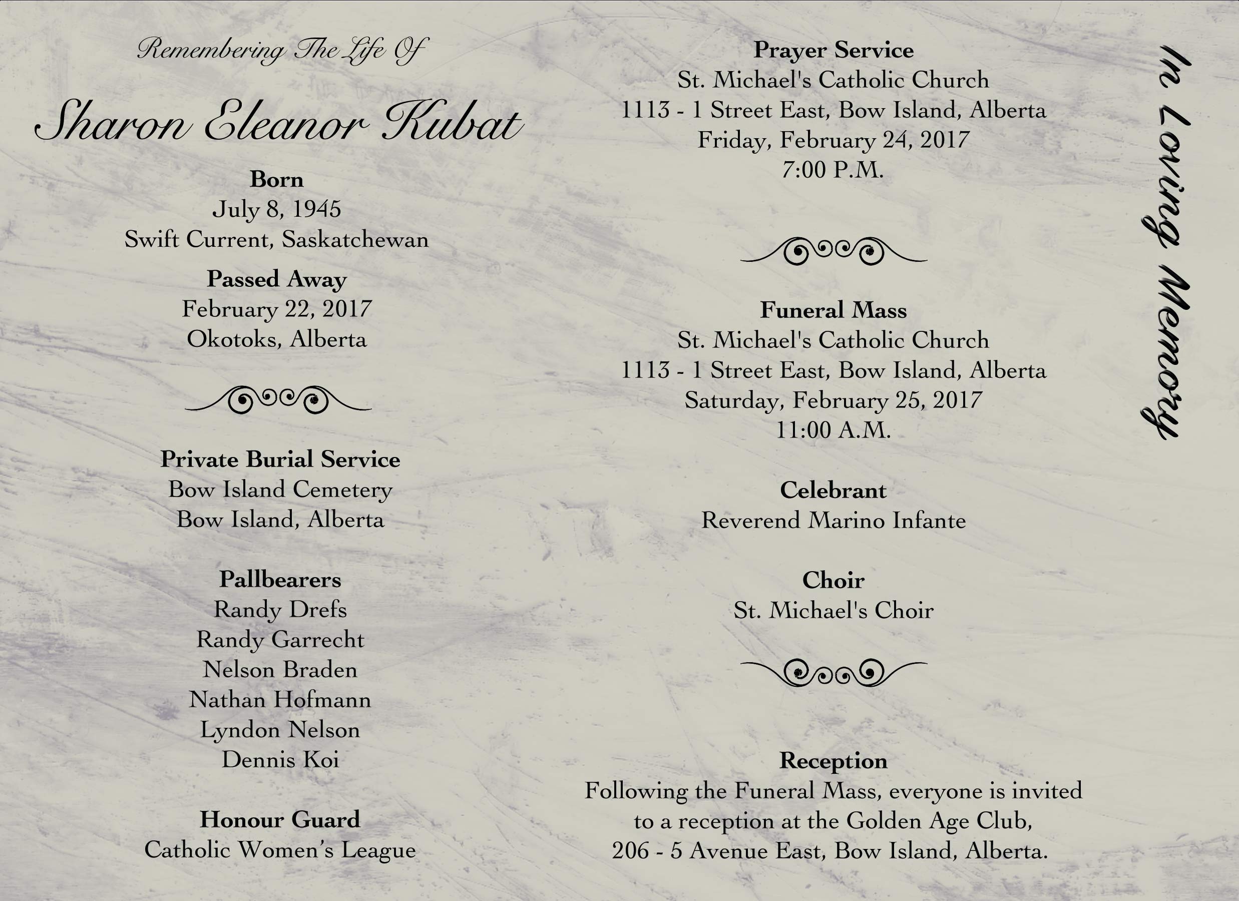 The Funeral Mass was celebrated at St. Michael's Catholic Church, 1113 - 1 Street East, Bow Island on Saturday, February 25, 2017 at 11:00 A.M. A private burial followed at the Bow Island Cemetery.