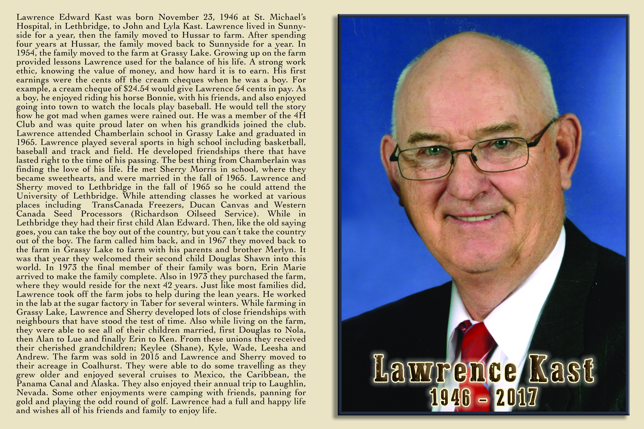 Lawrence was born in Lethbridge on November 23, 1946 and spent the majority of his life on a farm at Grassy Lake.