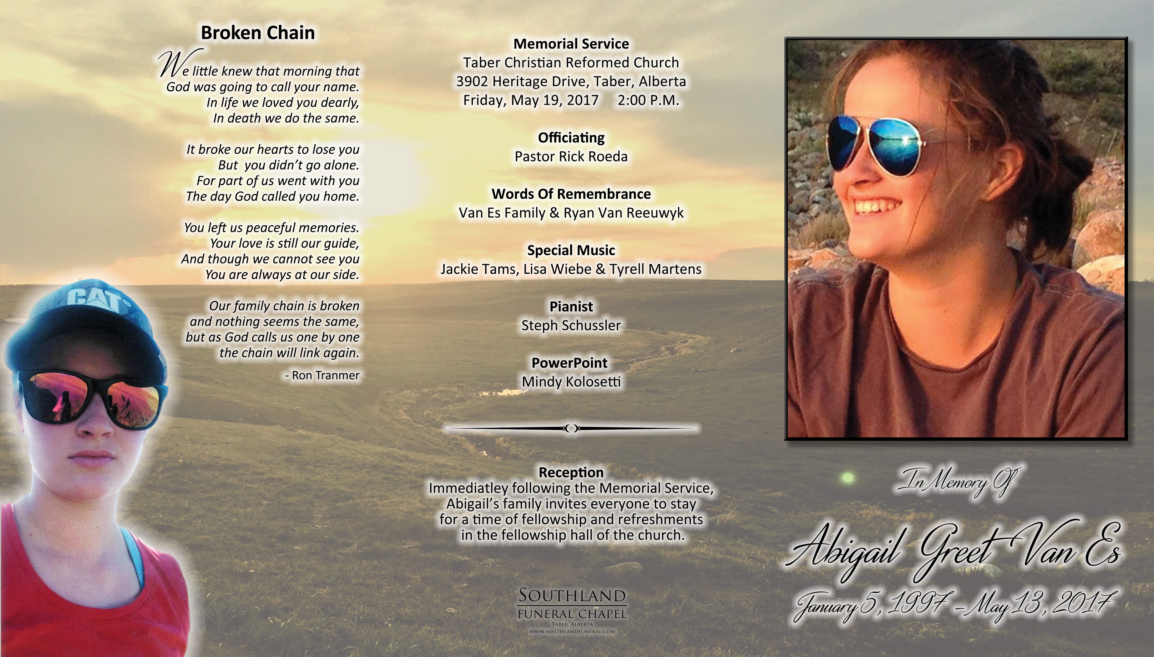 Born January 5, 1997 in Bow Island to Gerald and Renske Van Es, she was the fifth of seven children Hannah, Joshua, Reeka, Marrit, then Abigail followed by Aaron and Katrina.