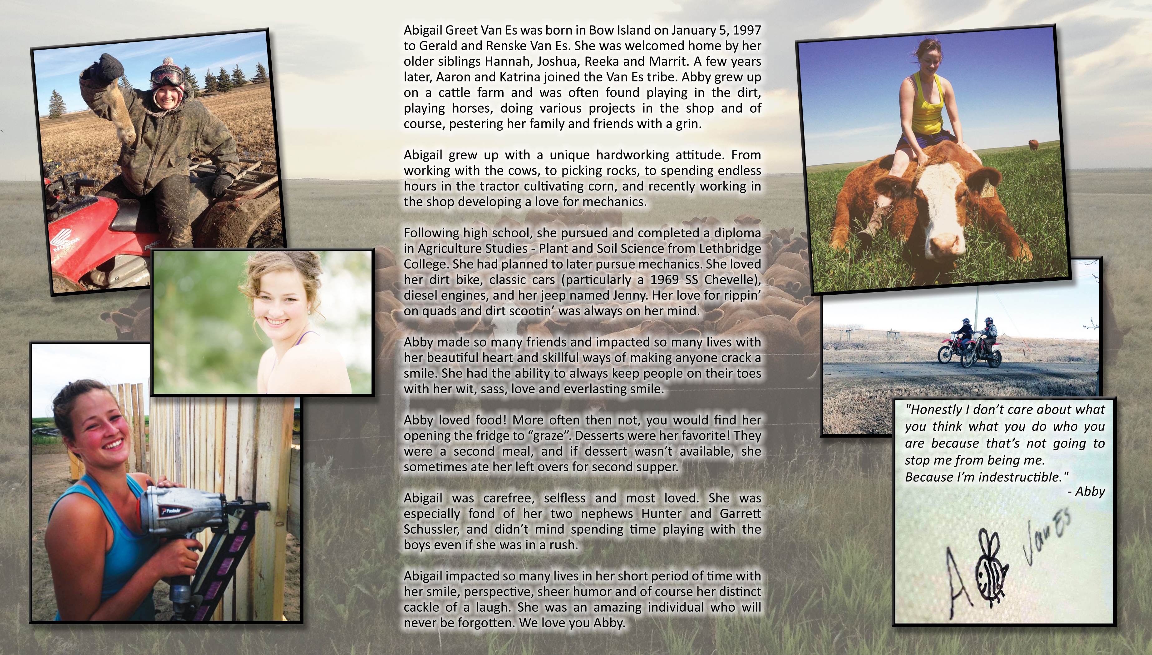 From a very young age she developed a vibrant and unique personality. Abby loved and was loved fiercely, quick to tease and annoy her family and friends. She was passionate about cows, dirt biking, fishing, food, mechanics, classic cars, “need to know” facts of the day and gopher hunting.