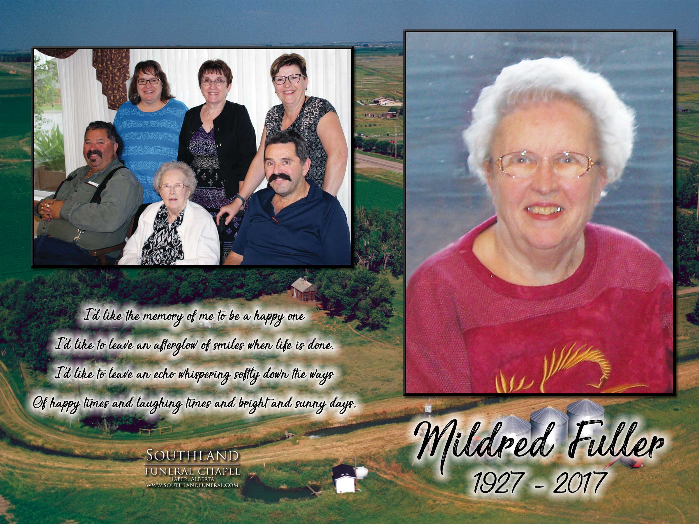 Millie will be lovingly remembered by her sons Jim Fuller of Taber and Allen (Muriel) Fuller of Calgary; daughters Marilyn (Chuck) Wallace of Taber, Cheryl (Steve) Nixon of Lethbridge and Patricia (Don) Huxley of Lethbridge; thirteen grandchildren and seven great grandchildren.