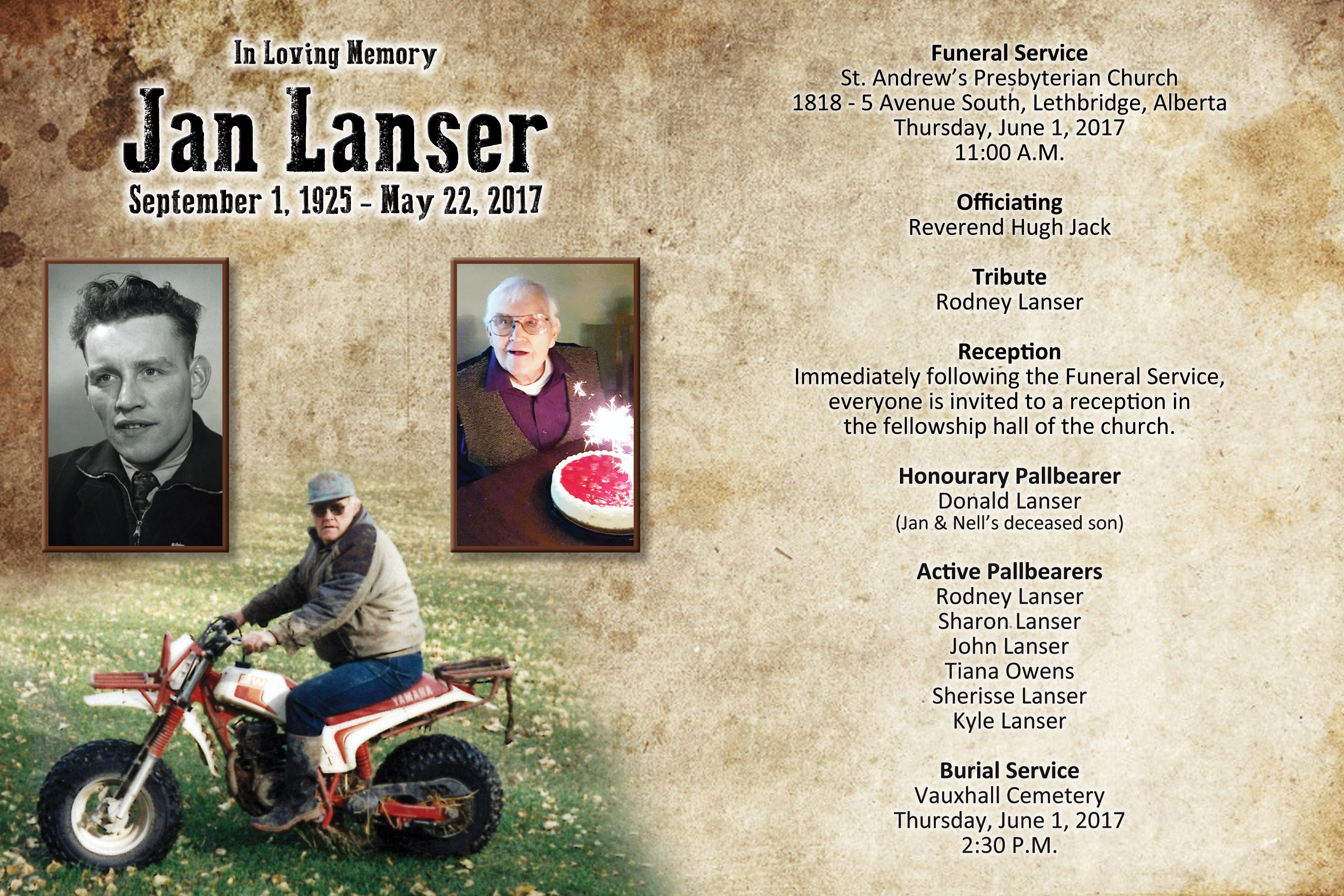 The Funeral Service was held at St. Andrew's Presbyterian Church, 1818 - 5 Avenue South, Lethbridge on Thursday, June 1, 2017 at 11:00 A.M. The Burial Service followed at the Vauxhall Cemetery at 2:30 P.M.