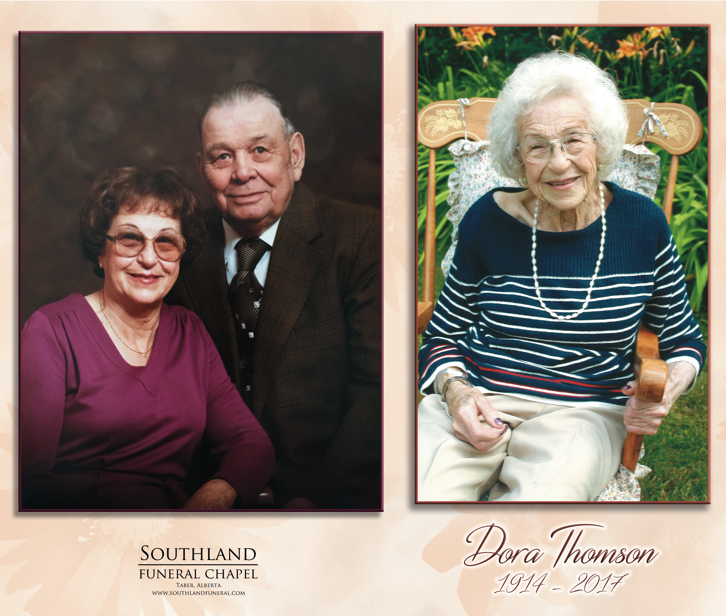 Dora was born in Magrath on September 23, 1914. She was the sixth of eight children born to Bryan and Josie Meldrum. Dora married George Albert Thomson of Raymond in 1933. She worked for almost thirty years as a nurse’s aide in the Raymond Home. Dora loved to cook and was famous for her delicious desserts and wonderful homemade, “Grandma T buns". She was a devout member of the LDS faith and loved genealogy, family history and Temple work. Dora loved to listen to uplifting music and read good books. She also enjoyed beautiful flowers and working in the garden. Dora served everyone and anyone. Service was her life.