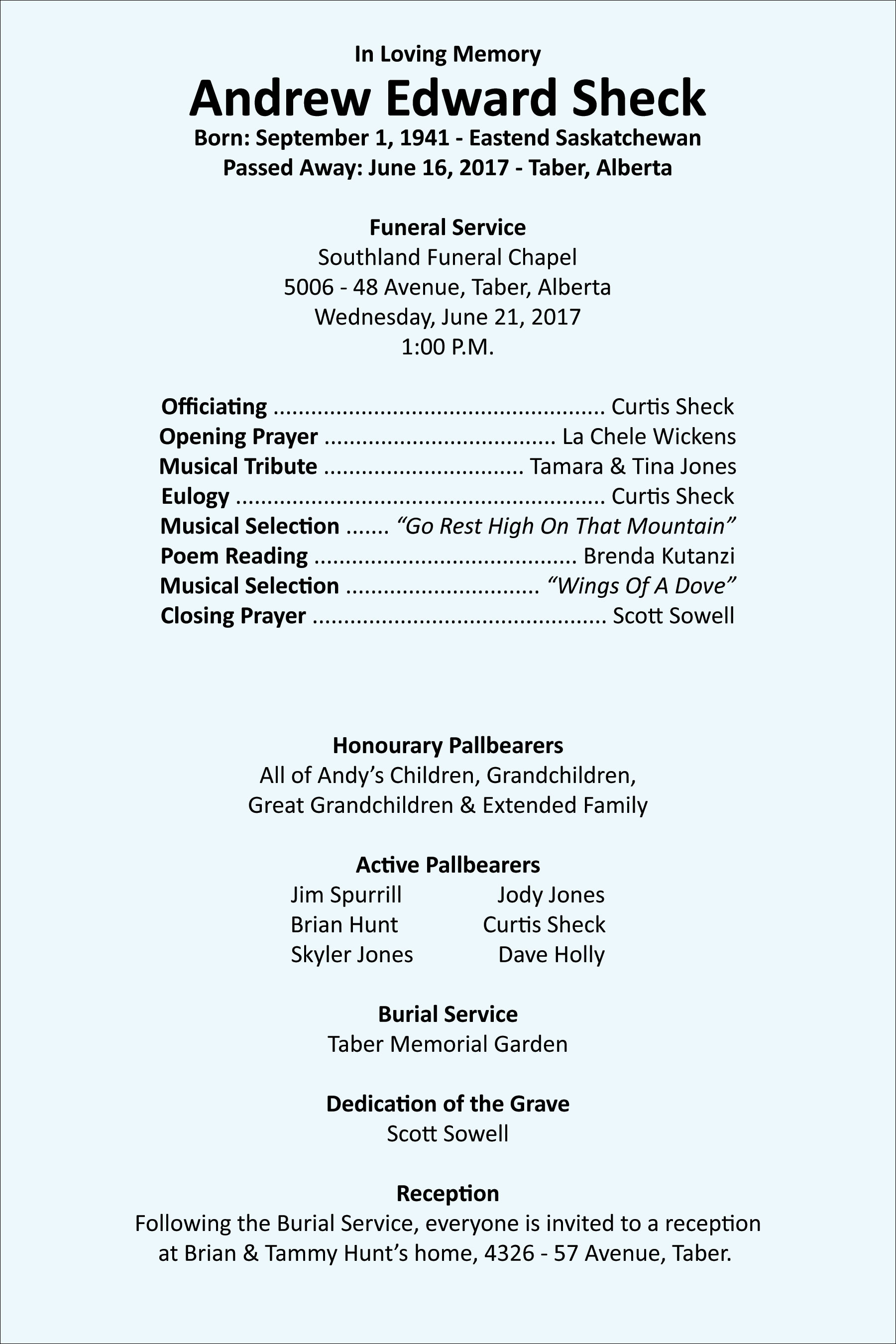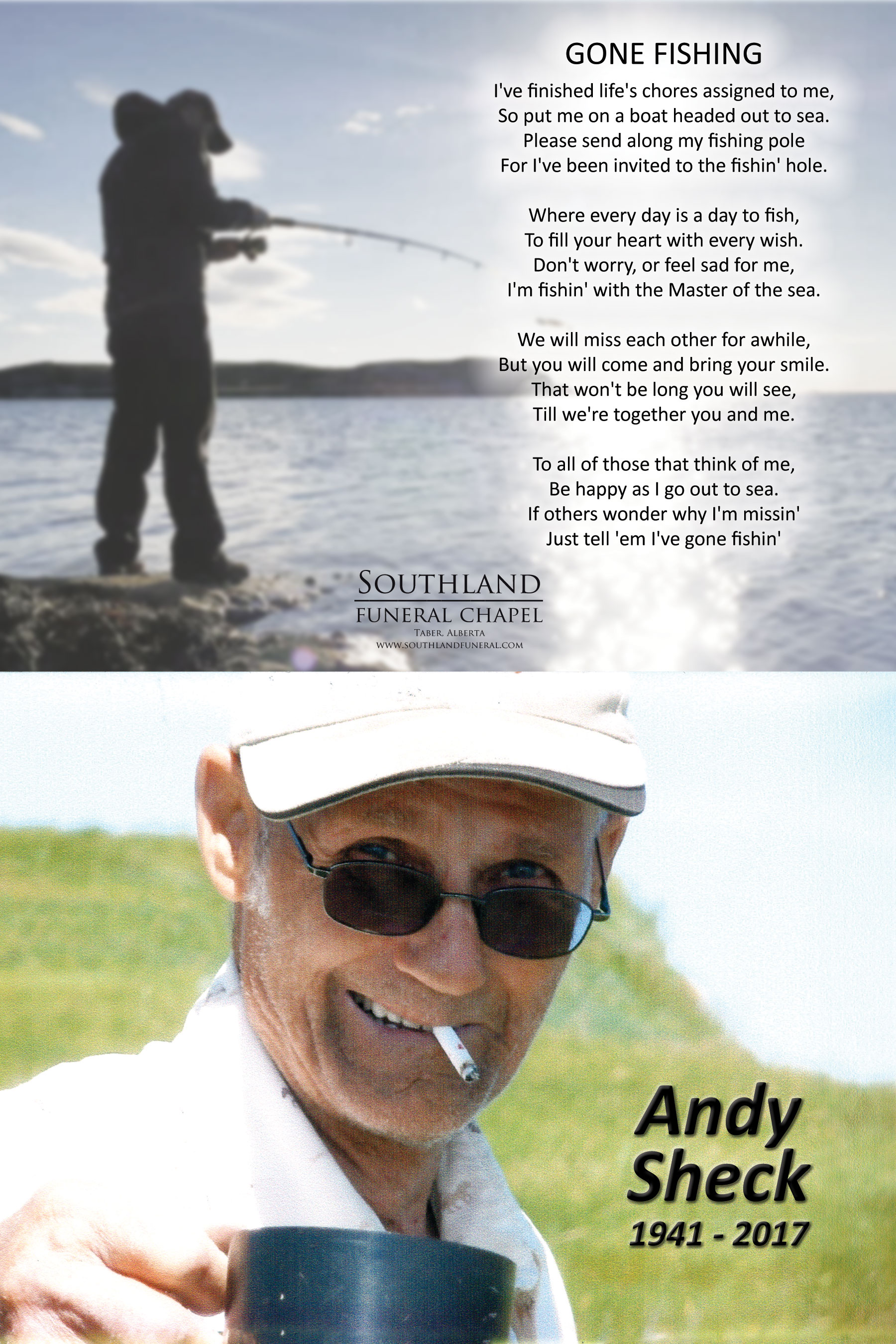 Besides his companion Darlene, Andy is survived by his children Marianna (Jim) Spurrill of Killarney, Manitoba, Brian (Tammy) Hunt of Taber, Jeff (Tammy) Sheck of Edson, April (Jody) Jones of Taber, Danny (Sandy) Sheck of Wetaskiwin and Kenny (Chantelle) Sheck of Lethbridge. He is also survived by eight grandchildren, five great grandchildren, sister Diane Sheck, sister-in-law Bonnie (Phil) Wallbank as well as his very good friends, coffee buddies and neighbors, the Langkopf family.