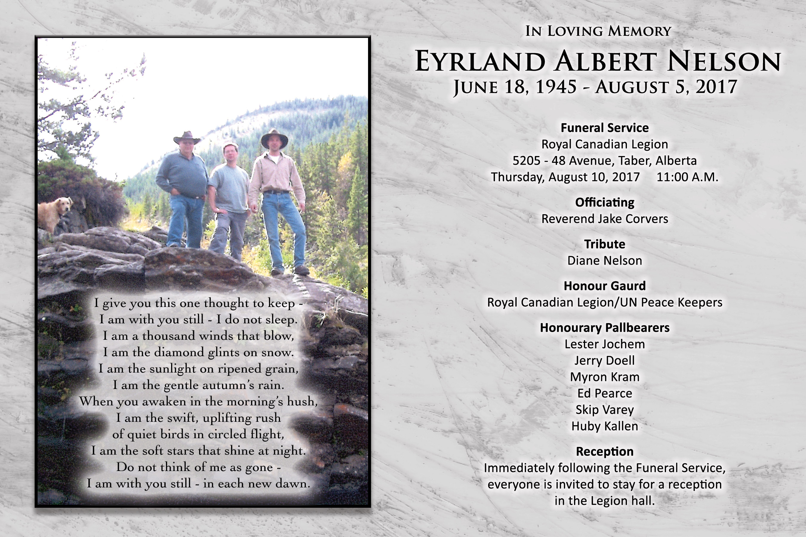 The Funeral Service was held at the Royal Canadian Legion, 5205 - 48 Avenue, Taber on Thursday, August 10, 2017 at 11:00 A.M.