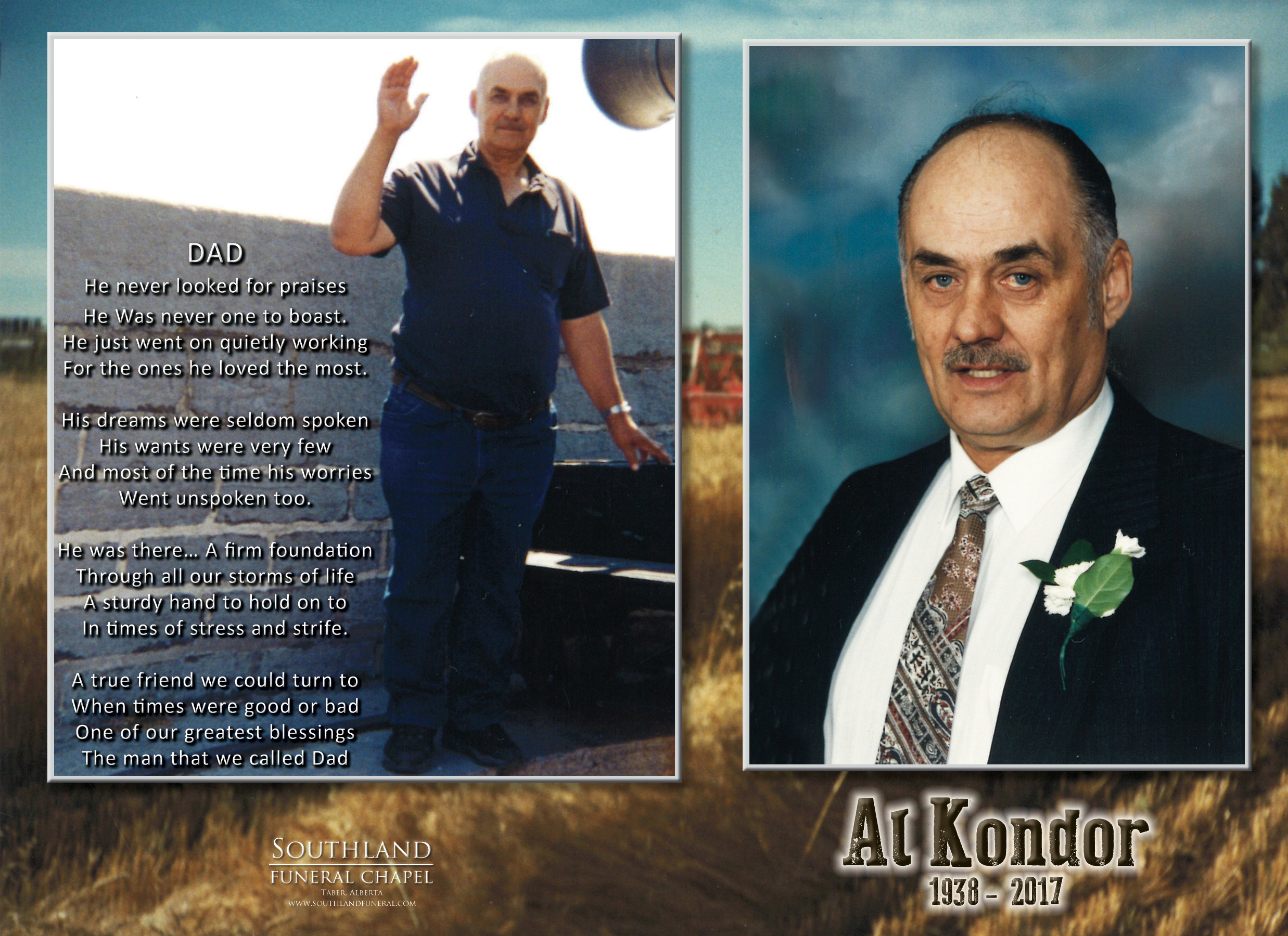 Relatives and friends were invited to Prayers at Southland Funeral Chapel, 5006 - 48 Avenue, Taber on Thursday, August 31, 2017 at 7:00 P.M.