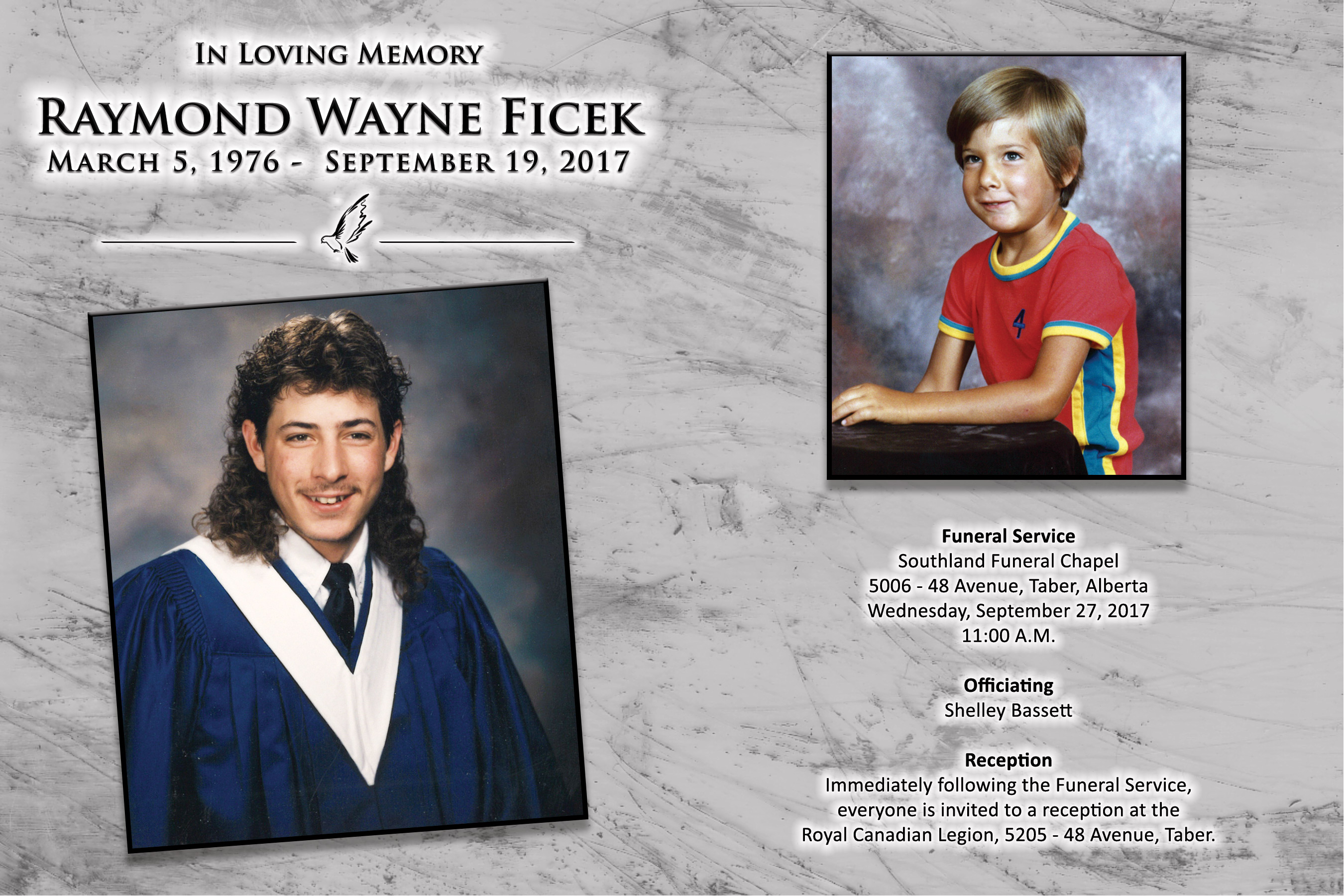 It is with great sadness that the family of Raymond Wayne Ficek, beloved son of Ron and the late Marie Ficek, announce his passing in Calgary on Tuesday, September 19, 2017 at the age of 41 years after a brief battle with cancer.