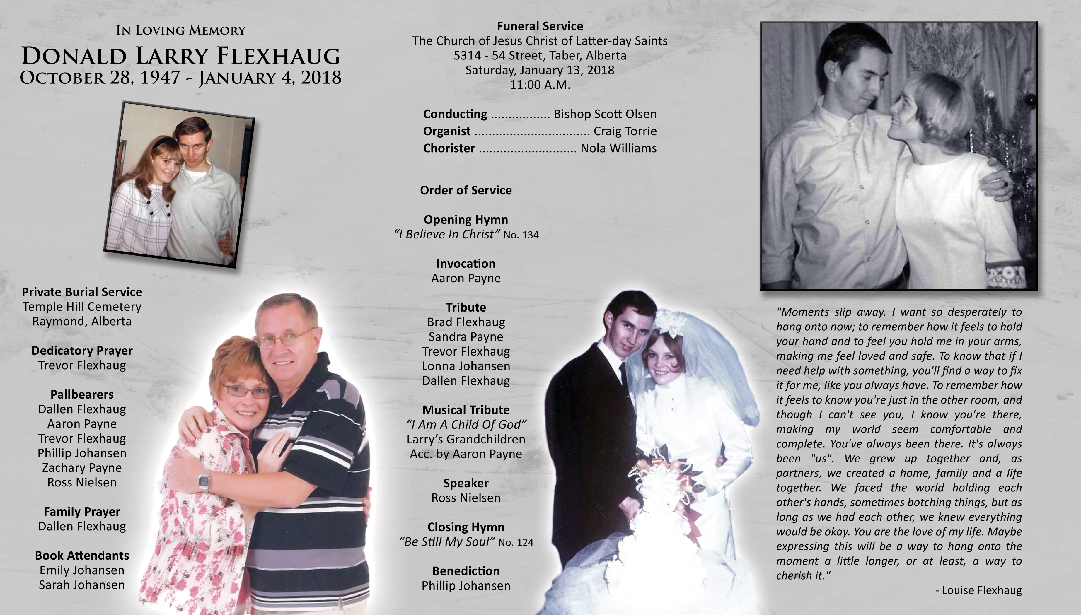 Besides his loving wife Louise, Larry is survived by their children Brad (Kami) Flexhaug of Chehalis, Washington and their family Shannon, Megan, Adam, Nathan and Allison; Sandi (Aaron) Payne of Taber and their family Austin, Zachary, Evan, Riley and Liam; Trevor (Jenn) Flexhaug of Lethbridge and their family Carter, Spencer, Denina and Annabelle; Lonna (Phil) Johansen of Taber and their family Emily, Ben, Josh and Sarah; Dallen (Marinda) Flexhaug of Coaldale and their family Nash and McCoy. He is also survived by his sisters Norma Richter, Shirley Flexhaug and their families.