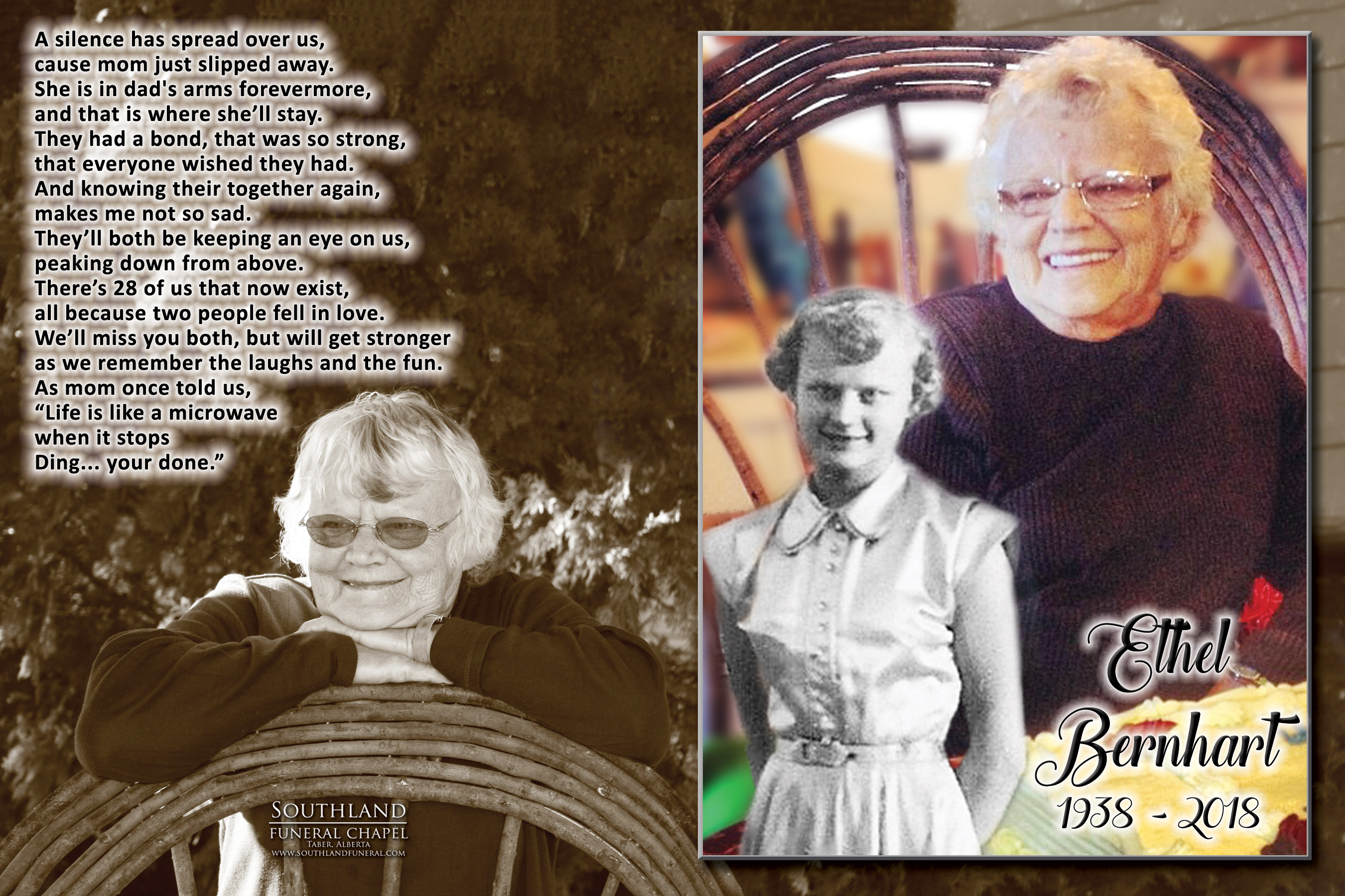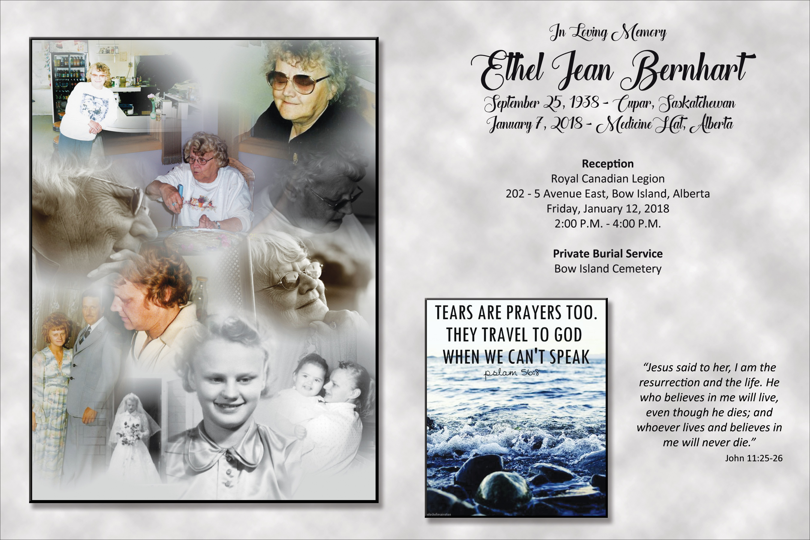 Ethel leaves to cherish her memory two daughters Gerry (Don) Johnson of Bow Island and Shelly (Glen) Galipeau of Medicine Hat; four sons Darwin (Carol) Bernhart of Medicine Hat, Mike (Sara) Bernhart of Medicine Hat, Daniel (Laura) Bernhart of Redcliff and James (Jolean) Bernhart of Medicine Hat; sister Lee Doell; eleven grandchildren and seven great grandchildren, as well as numerous nieces and nephews.
