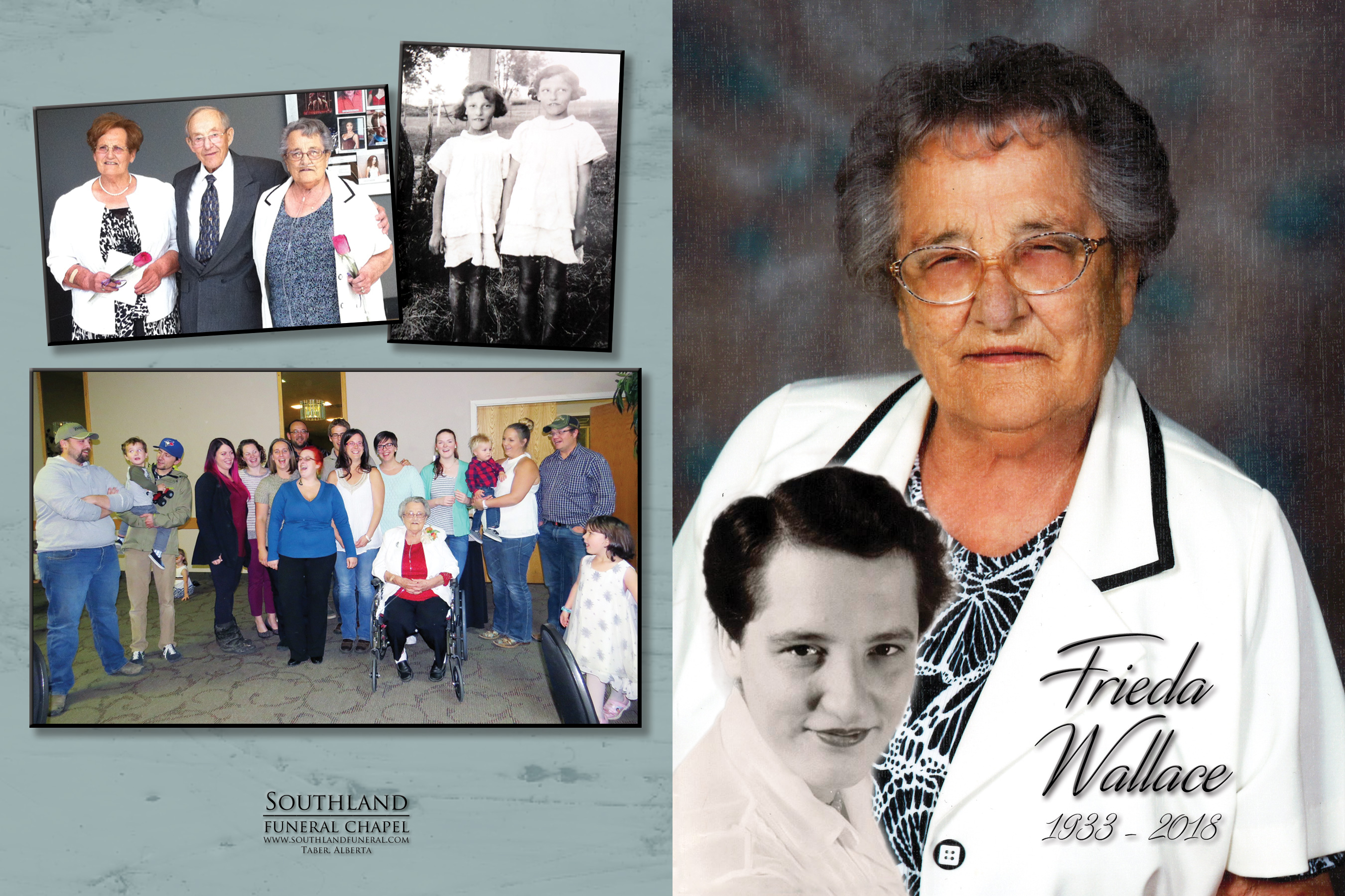 Frieda is survived by her children Alan Wallace of Forestburg, Randy (Andrea) Wallace of Baltimore, Maryland and Robert (Joan) Wallace of Hays; her loving grandchildren Amanda (Lincoln) Sipko, Heather (Christopher) Ehnes, Jillian (Matthew) Vanden Dungen, Christel (Cody) Todd, Jennifer Wallace, Brenna (Fabian) Pahl, Megan Wallace, Russell Wallace, Brittany (Dan) Bastian, Noelle (Ryan) Meier and by thirteen great grandchildren. She is also survived by her twin sister Hedwig "Hedy" Griffiths of Calgary and sisters-in-law Elsie Pipke, Helen Wallace and by numerous nieces, nephews, relatives and friends.