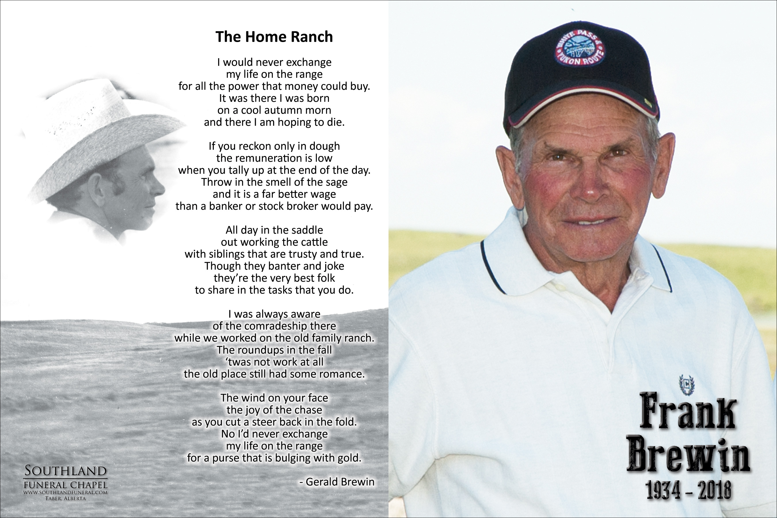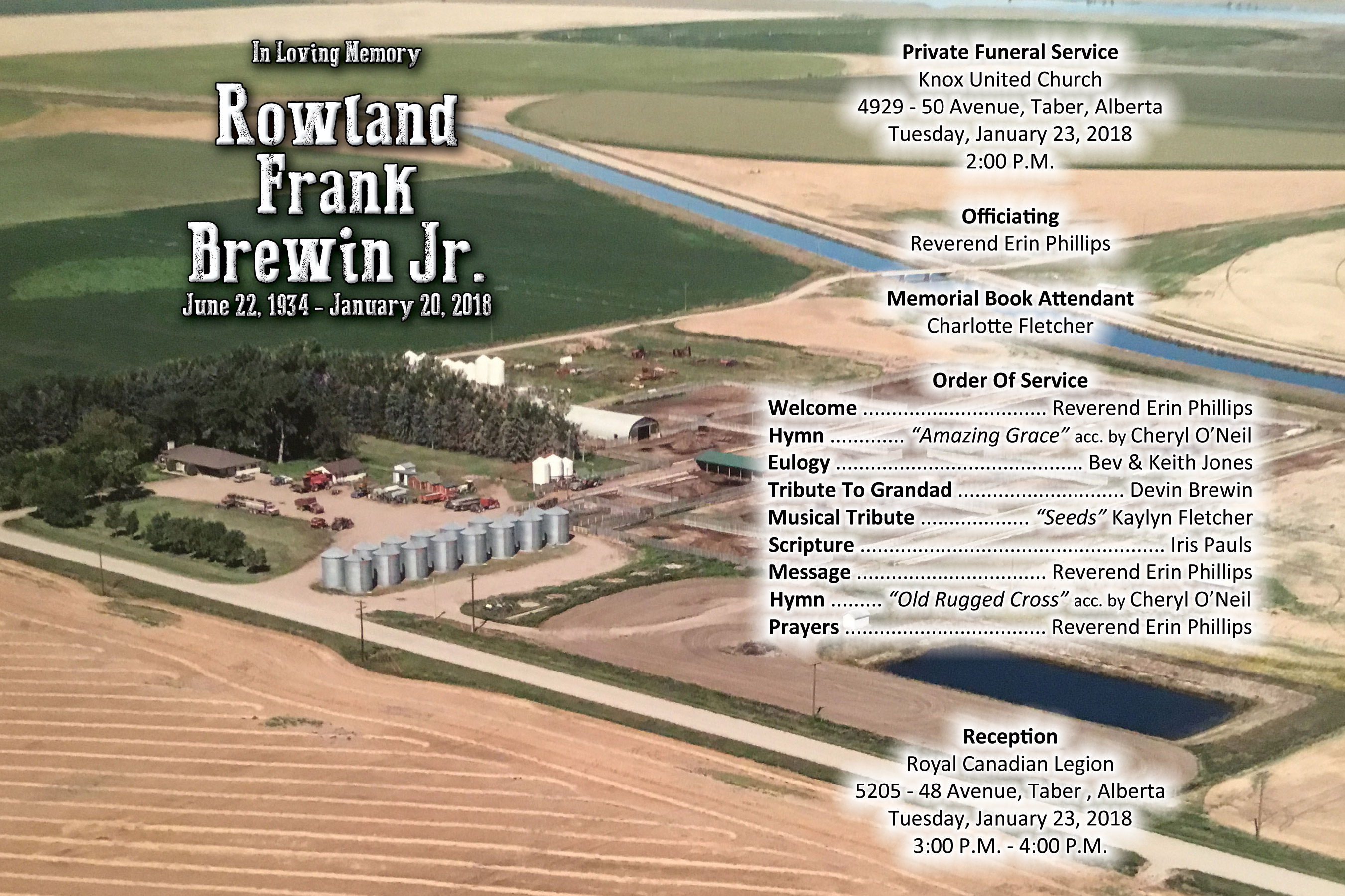 Rowland Frank Brewin Jr., passed away peacefully, surrounded by his beloved family in Taber on Saturday, January 20, 2018 at the age of 83 years.