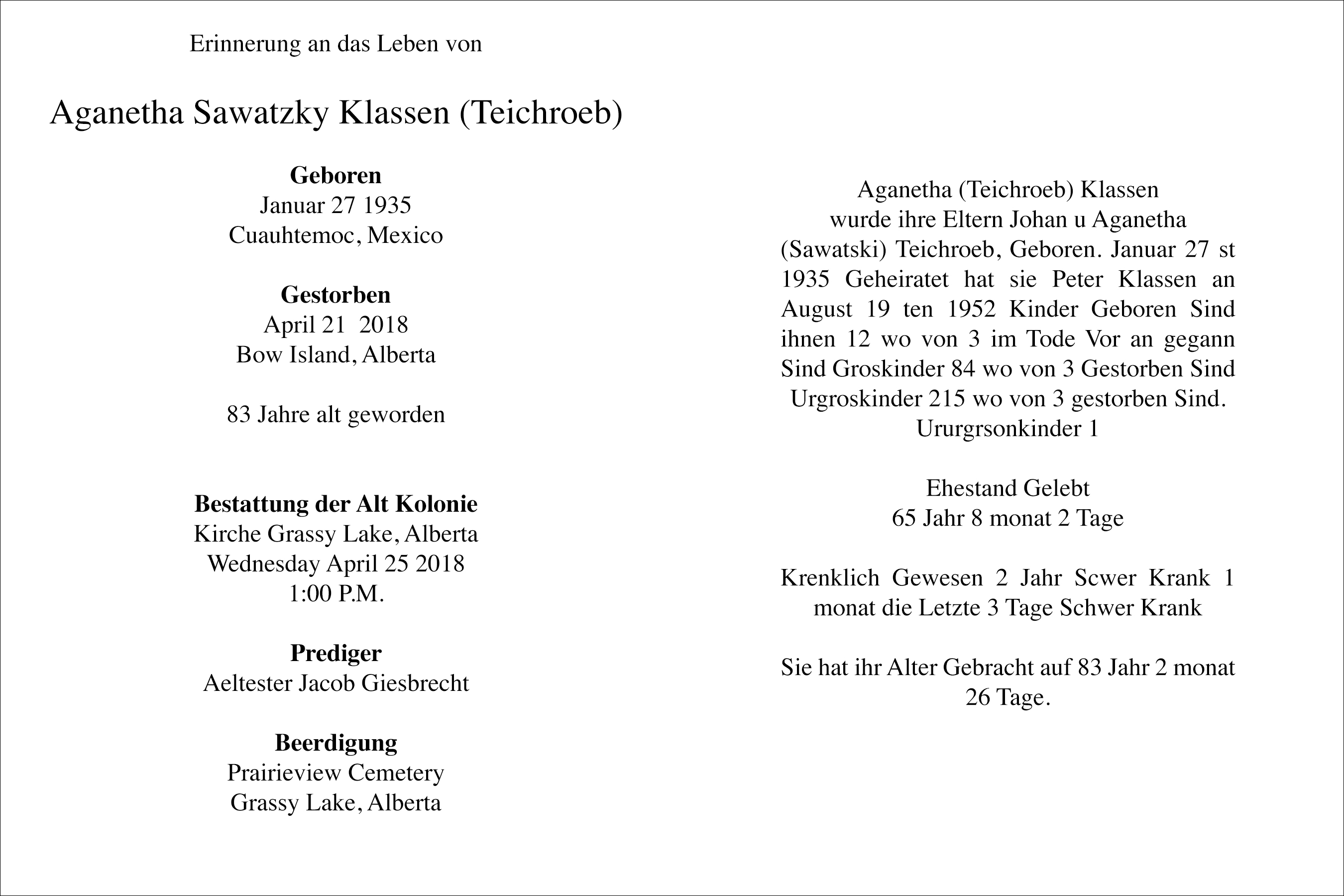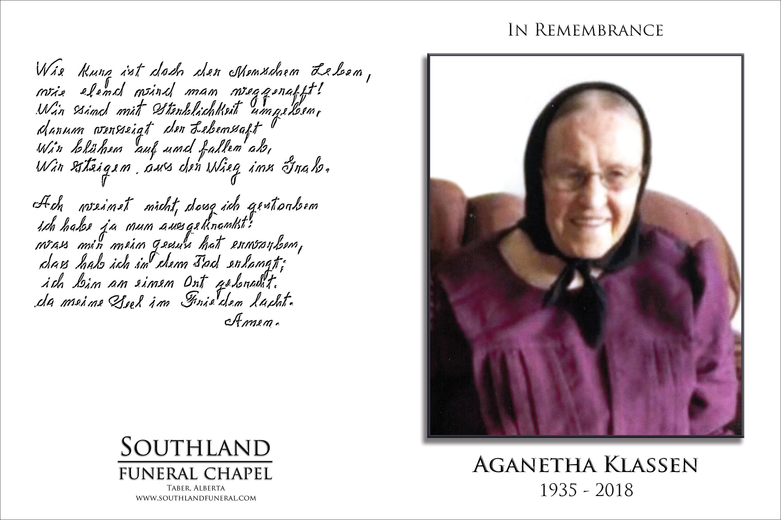 Aganetha Sawatzky Klassen, beloved wife of Peter Klassen, passed away in Bow Island on Saturday, April 21, 2018 at the age of 83 years.