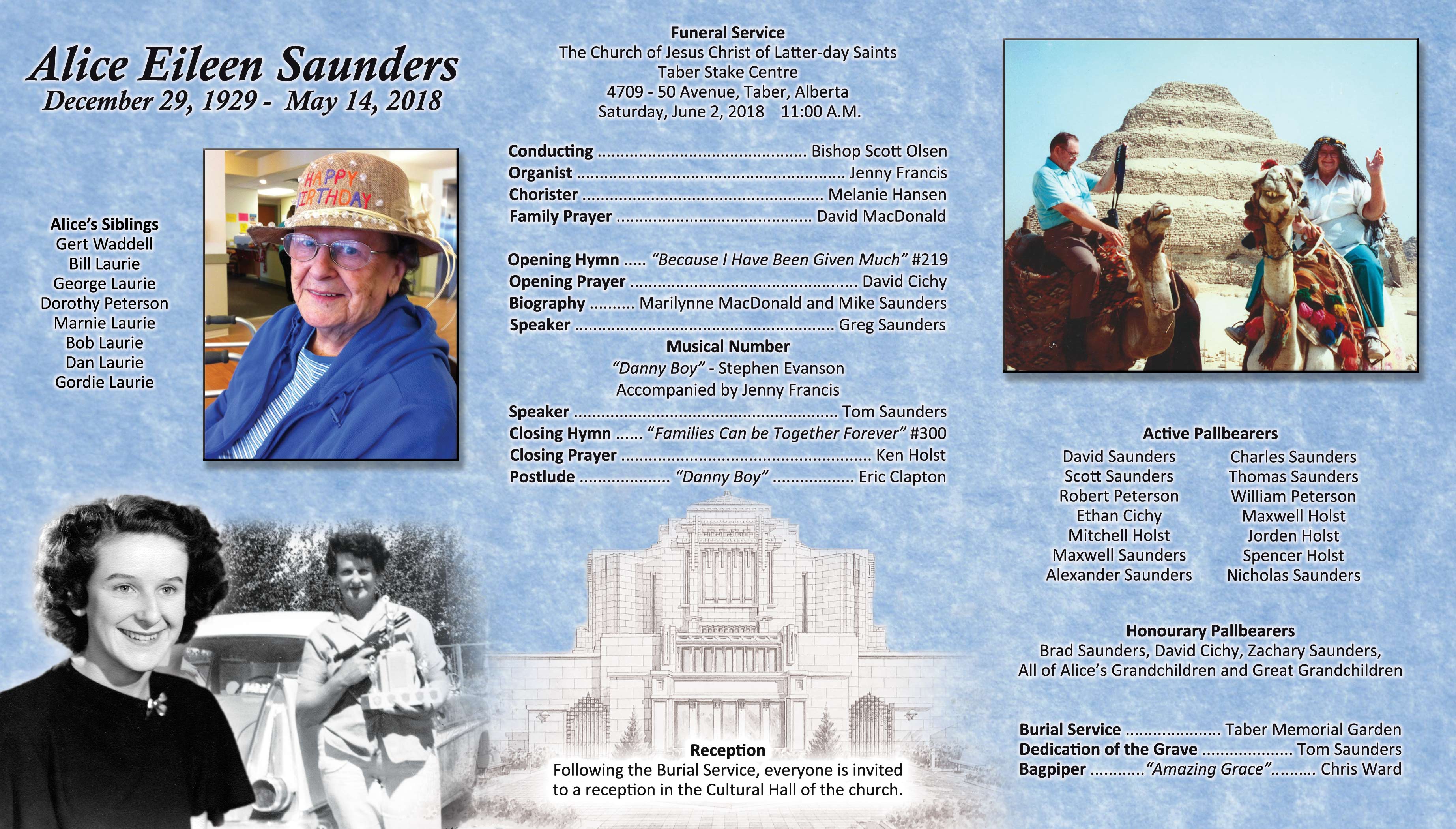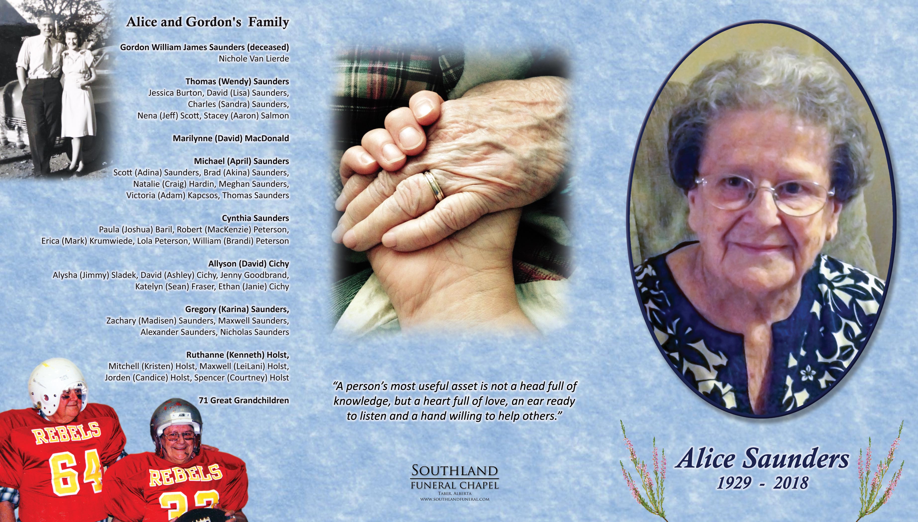 Alice is survived by her children Thomas (Wendy) Saunders of Victoria, British Columbia, Marilynne (David) MacDonald of Calgary, Michael (April) Saunders of Taber, Cynthia Saunders of High River, Allyson (David) Cichy of Calgary, Gregory (Karina) Saunders of Highland, Utah, Ruthanne (Ken) Holst of Taber and by thirty grandchildren and seventy one great grandchildren. She is also survived by her sisters-in-law Pauline Laurie, Bev Laurie, Arlie Laurie, Shirley Andrews, Jeri Saunders and numerous nieces and nephews.