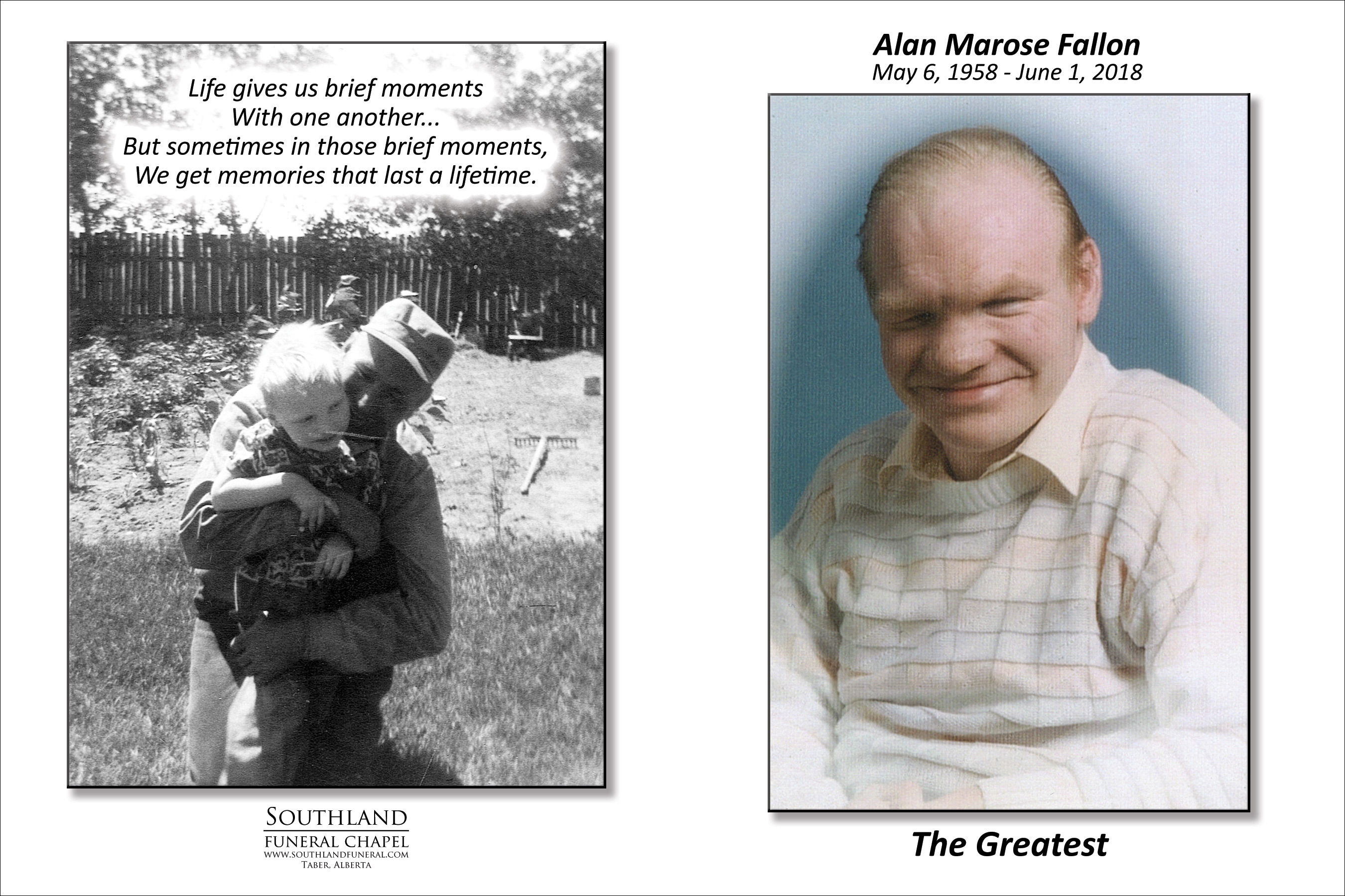 It is with sadness the siblings of Alan Marose Fallon announce his passing in Bow Island on Friday, June 1, 2018 at the age of 60 years.