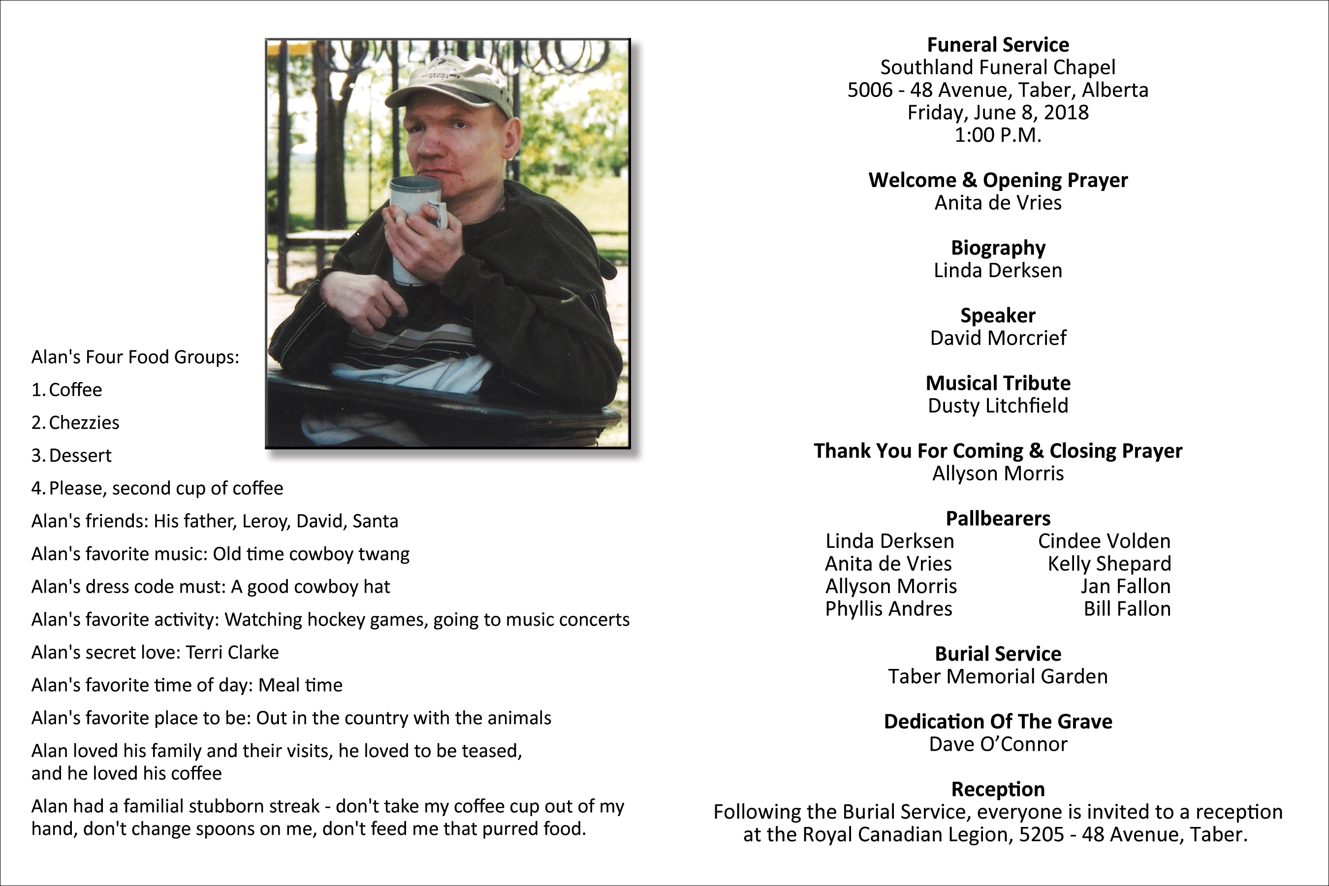 Alan will be remembered by his brother Bill Fallon of Raymond; sisters Linda (Henry) Derksen of Strathmore, Anita (Dick) deVries of Enchant, Allyson (Lance) Morris of Medicine Hat, Phyllis (John) Andres of Lethbridge, Cindee (Hanley) Volden of Edmonton, Kelly (Mike) Shepard of Medicine Hat and Jan Fallon of Taber as well as numerous nieces, nephews and cousins.