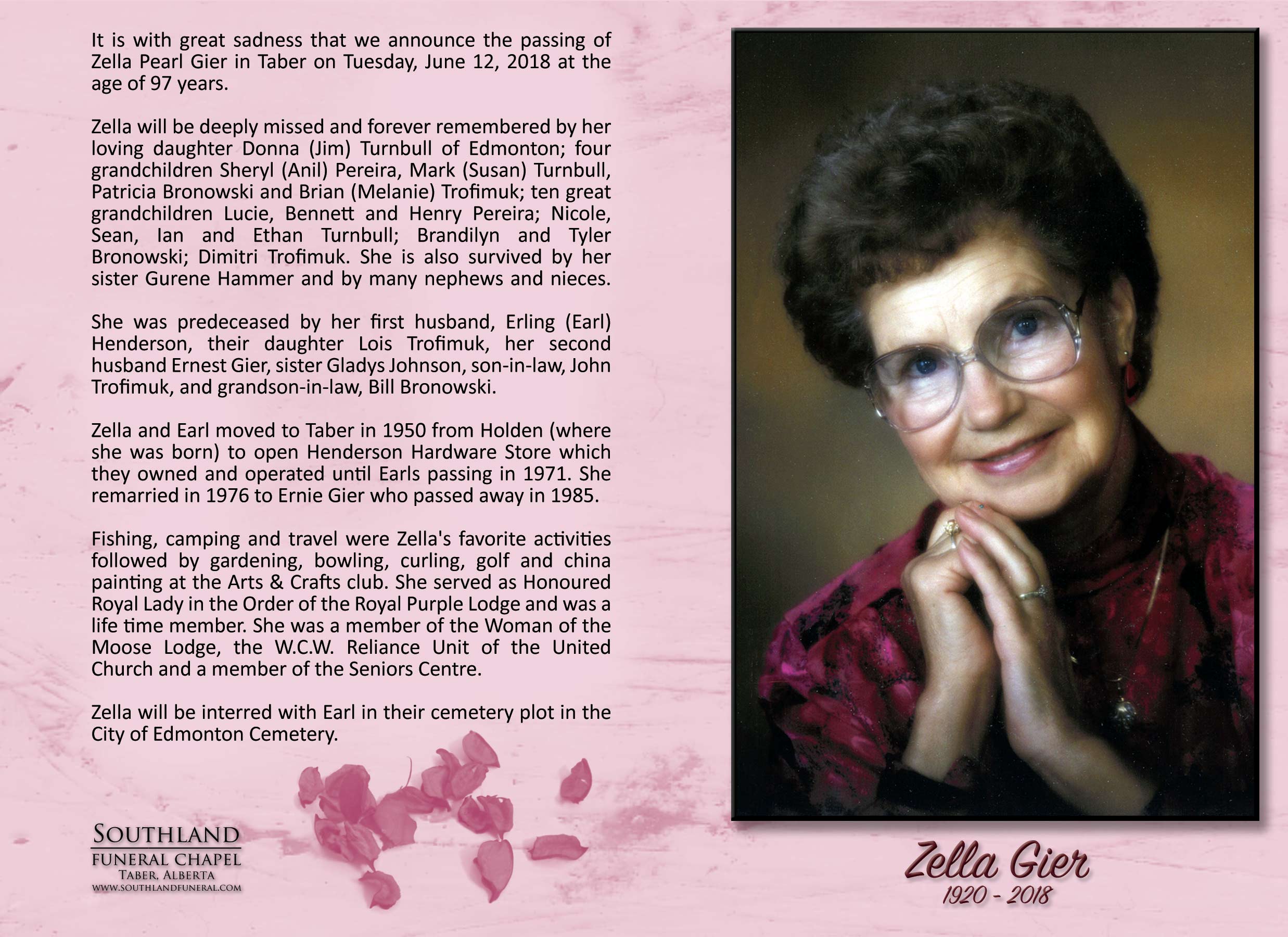 Zella and Earl moved to Taber in 1950 from Holden (where she was born) to open Henderson Hardware Store which they owned and operated until Earls passing in 1971. She remarried in 1976 to Ernie Gier who passed away in 1985.
