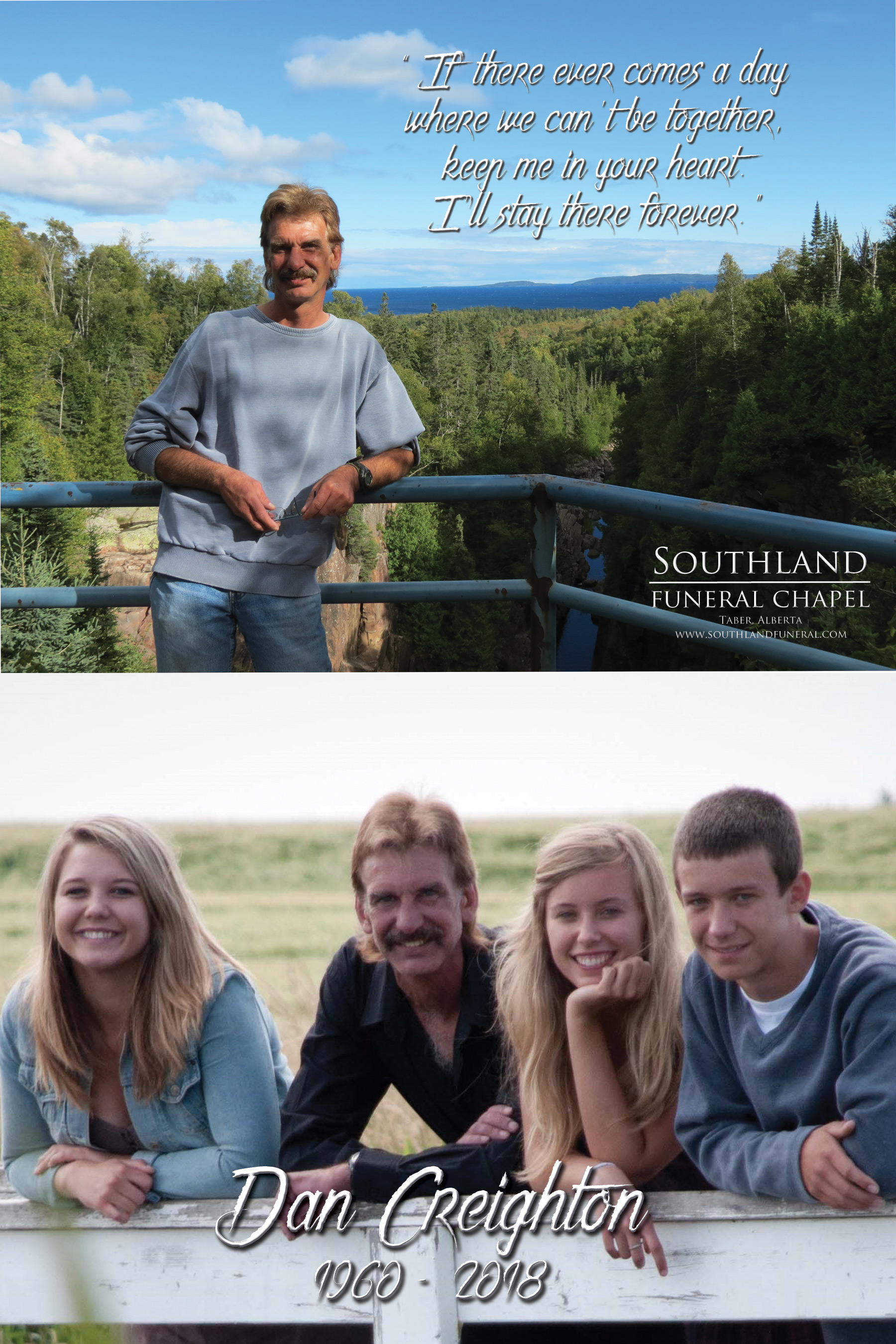 Dan was born in Drumheller on July 29, 1960, the eldest of three children. At the age of two, he travelled with his parents on a shipping freighter to embark on a cross cultural experience as the son of missionaries. He remained in Africa for twelve years attending Bingham Academy Boarding School until he was fifteen years of age. The family moved back to Canada and Dan graduated from Vauxhall High School in 1978 with a passion for motorcycles and a sense of humour like no other. He then attended Berean Bible College in Calgary from 1981 - 1982. Later in Calgary, Dan met Ingrid Heier whom he married in 1987. He completed the Macro Economics & Fundamentals of Business Management program at Mount Royal College from 1988 - 1989, sharing an interest with his daughter who would inevitably come to pursue a career in a similar field. Dan became a father to three beautiful children whom he loved dearly and his greatest happiness stemmed from revelling in their accomplishments and creating moments of joy for them. His passion for computers aided him in developing his career and he pursued skill development from 2003 - 2005 and obtained Dale Carnegie Skills training. Dan was an apt business man and through his talent and love for wood working he created his own business under the name “Creighton’s Hobby Corner” where he was able to share his talent with others all across Alberta while partnering with DeWalt tools and Black & Decker Enterprises, paving the way for independent design and artistic appreciation for his son who has developed into a talented artist embarking on a similar journey. He then moved to Taber and obtained employment at Rogers Sugar where his skills as a previous manager and dedication shone through. Dan enjoyed fishing, camping, wood working, reading, cooking, technology and had an interest in culture. He was able to drive across Canada with his daughter and build a relationship with his granddaughter Stella sharing his competitive card playing spirit and love for other’s happiness, which his daughter carries forward. His loyalty to his children was inherent throughout his life and his kindness attracted a cat with nowhere else to go, to be his companion. Dan remained in Taber until his passing.