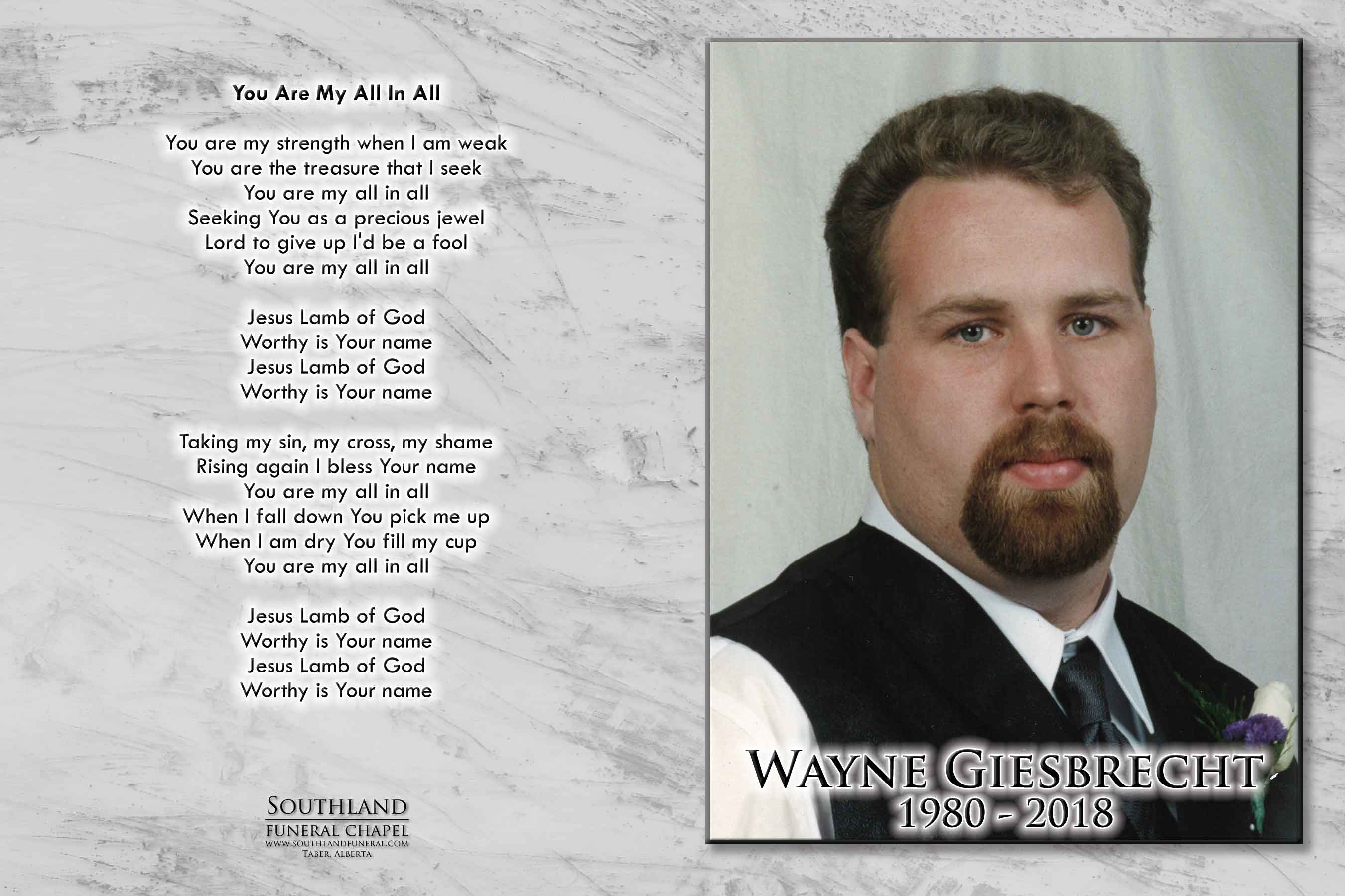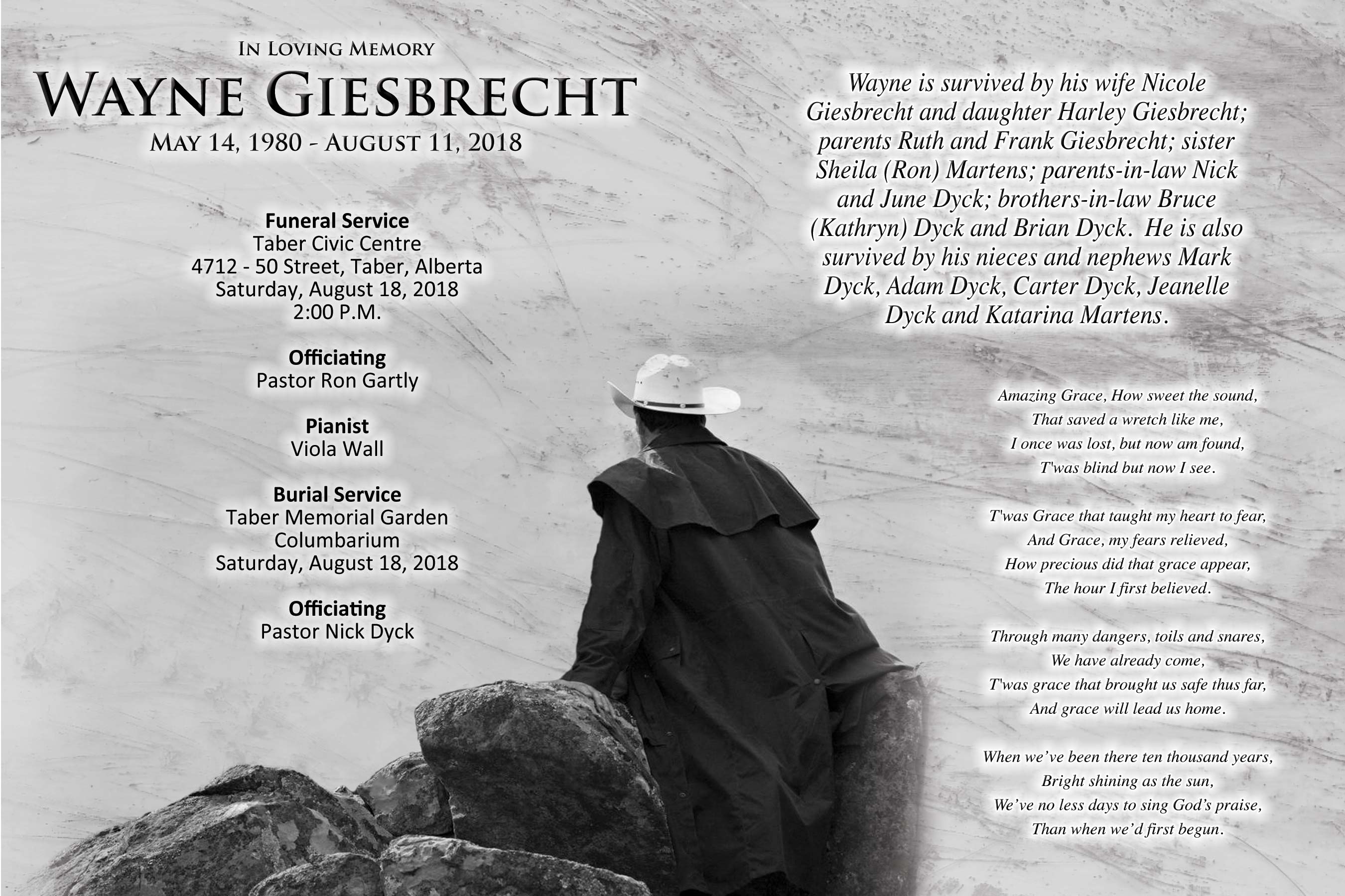 Wayne Allen Giesbrecht, beloved husband of Nicole Giesbrecht and loving father to Harley, passed away in Taber on Saturday, August 11, 2018 at the age of 38 years.