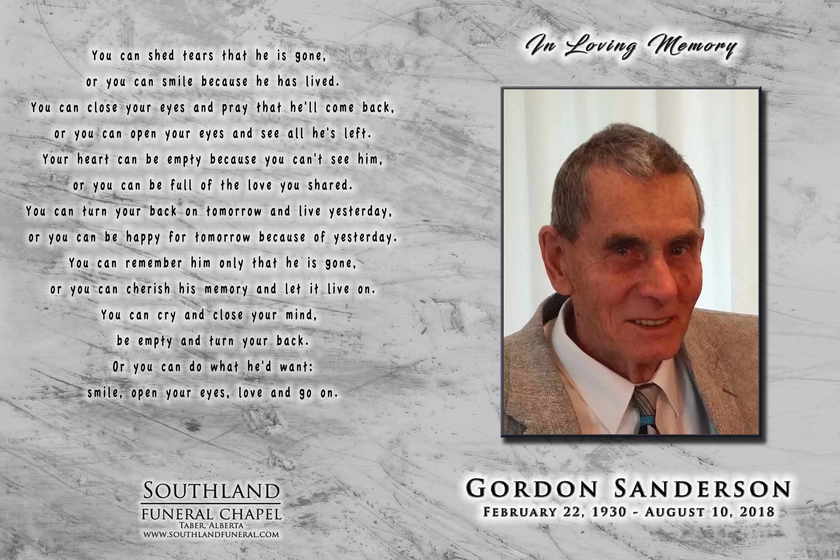 Gordon Samson Sanderson, born in Taber on February 22, 1930, passed away peacefully in Calgary on Friday, August 10, 2018 at the age of 88 years, with Gail, his loving wife of sixty three years at his side.