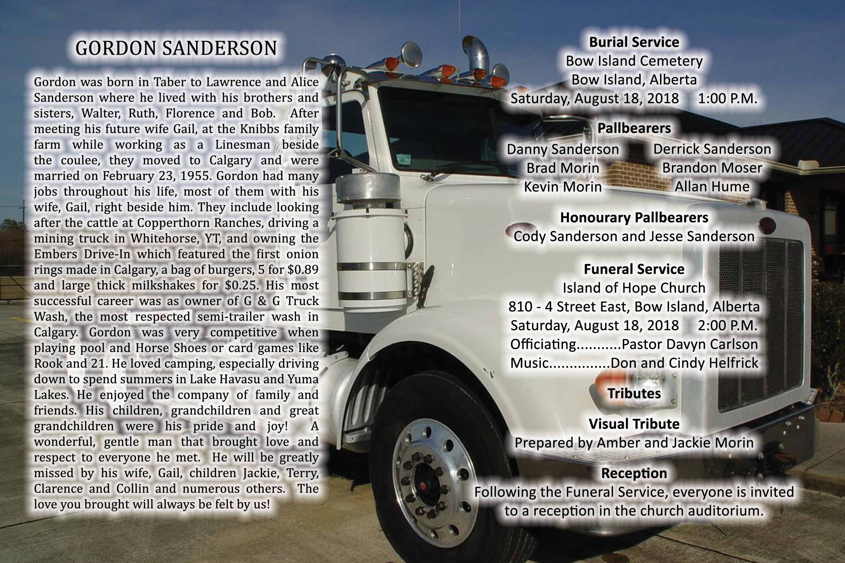 The Funeral Service was held at Island of Hope Church, 810 - 4 Street East, Bow Island on Saturday, August 18, 2018 at 2:00 P.M.