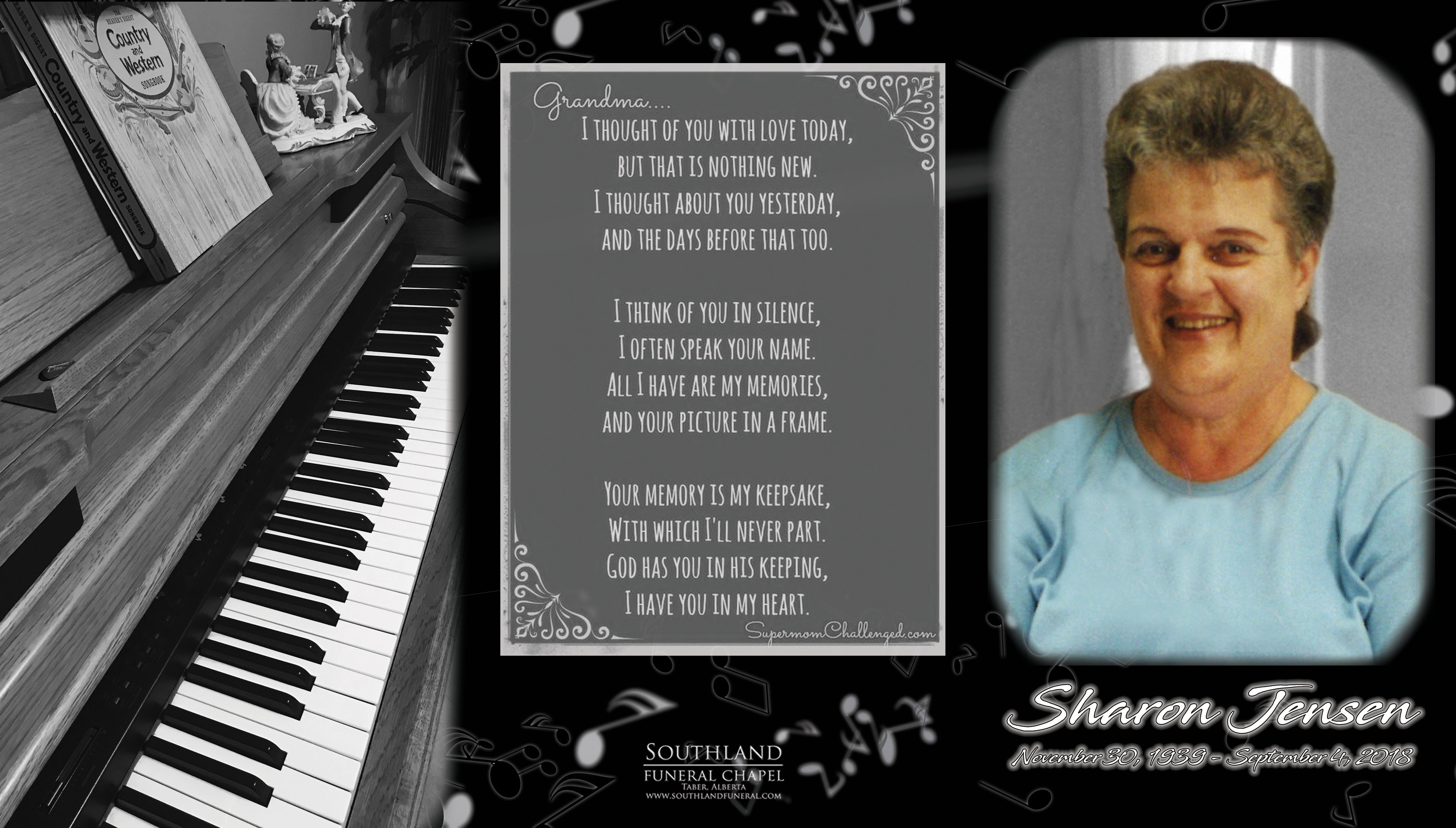 Sharon was born in Taber on November 30, 1939. She spent her school years in Taber and had many fond memories of fun times in high school with her siblings and lifelong friends. She often talked of sports teams, dances, teenage shenanigans and bands she played in. Sharon married Gary Jensen in 1959 and they had many happy adventures together. They lived in Conrad, Rimbey, Taber, Fort Nelson, back to Taber, Pincher Creek, Stavely, Lethbridge, then back to Taber again.