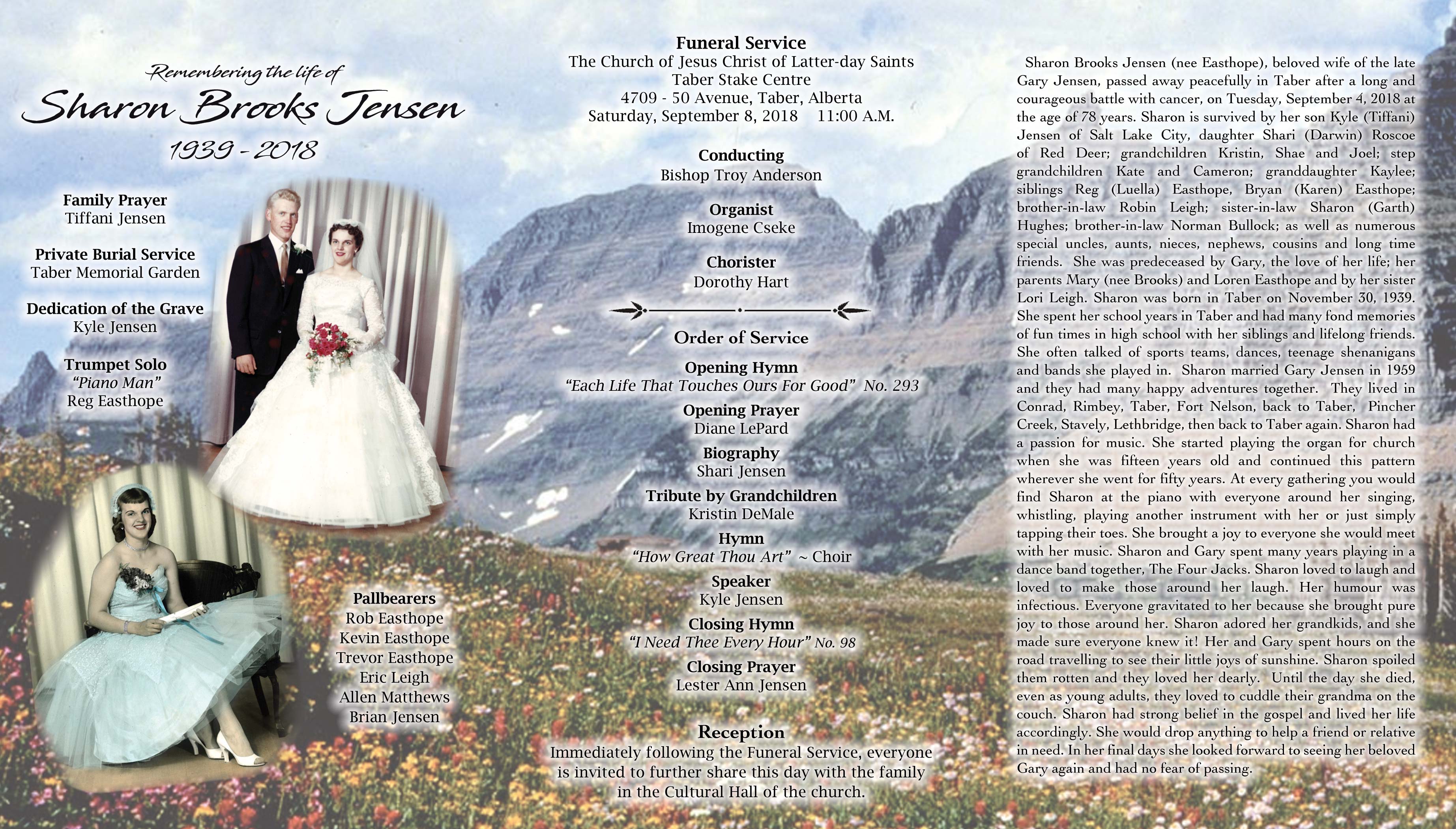Sharon Brooks Jensen (nee Easthope), beloved wife of the late Gary Jensen, passed away peacefully in Taber after a long and courageous battle with cancer, on Tuesday, September 4, 2018 at the age of 78 years.