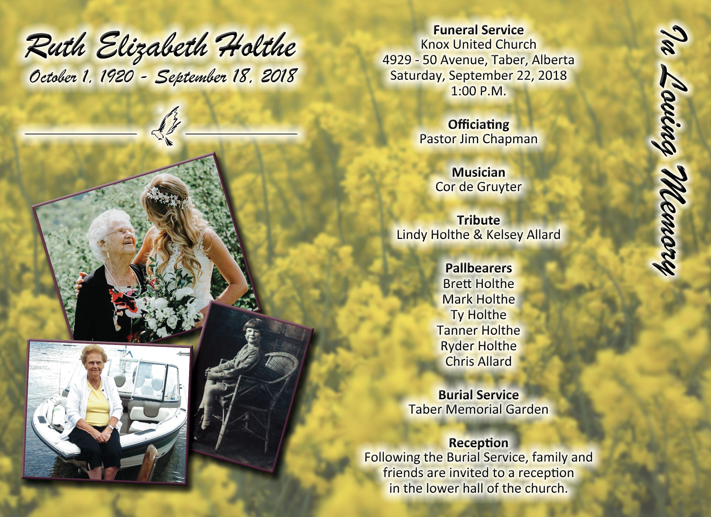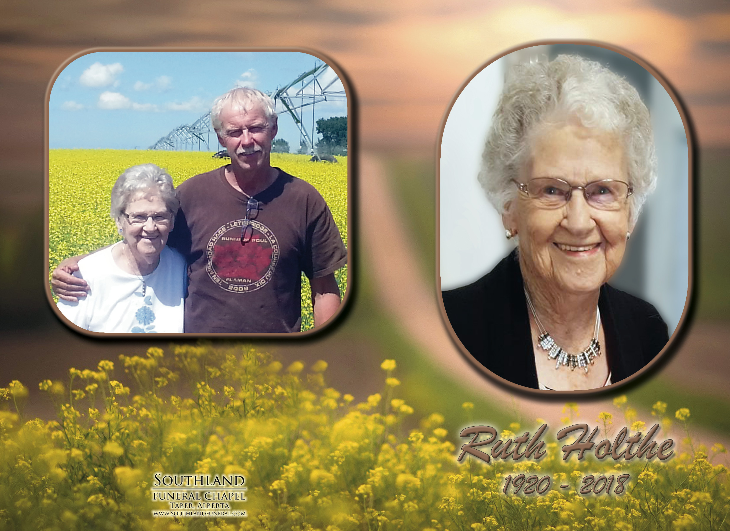 Ruth Holthe, mother, grandmother and great grandmother, passed away unexpectedly in Lethbridge on Tuesday, September 18, 2018, two weeks short of her 98th birthday.