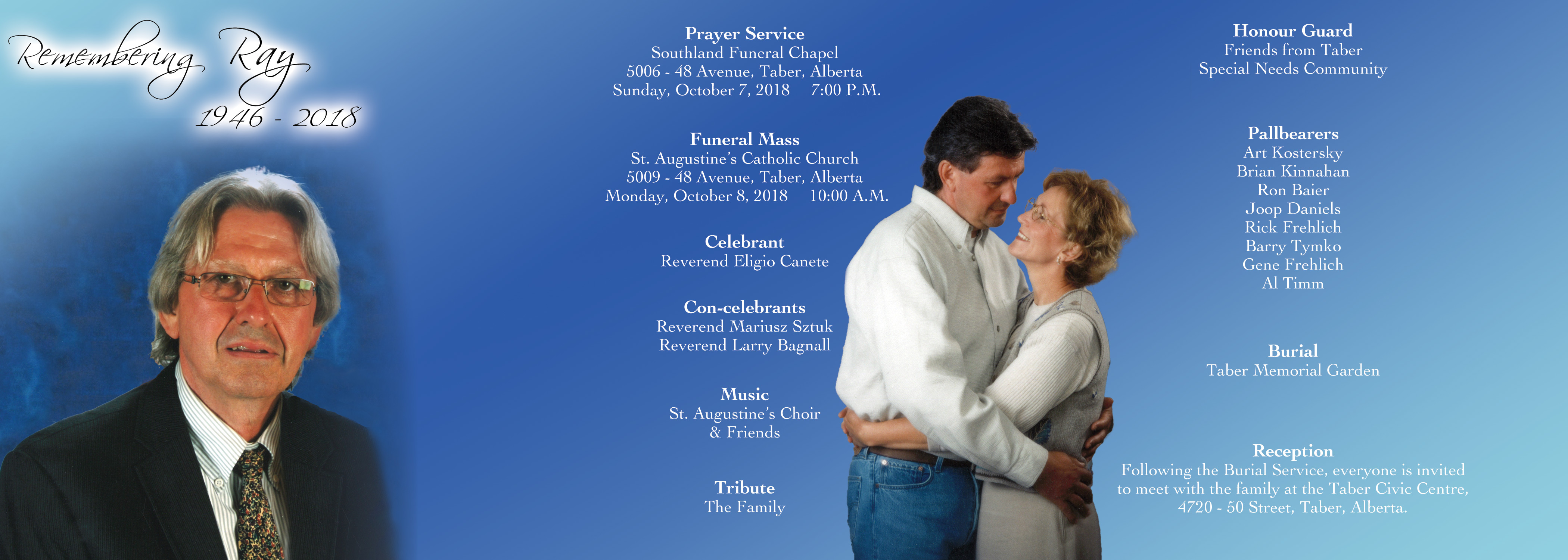 At Ray's request, in lieu of flowers, memorial tributes in his name may be made directly to the St. Vincent de Paul Society, 5009 - 48 Avenue, Taber, Alberta T1G 1T4 or to the Taber Food Bank Society, 5512 - 48 Avenue, Taber, Alberta T1G 1S4.