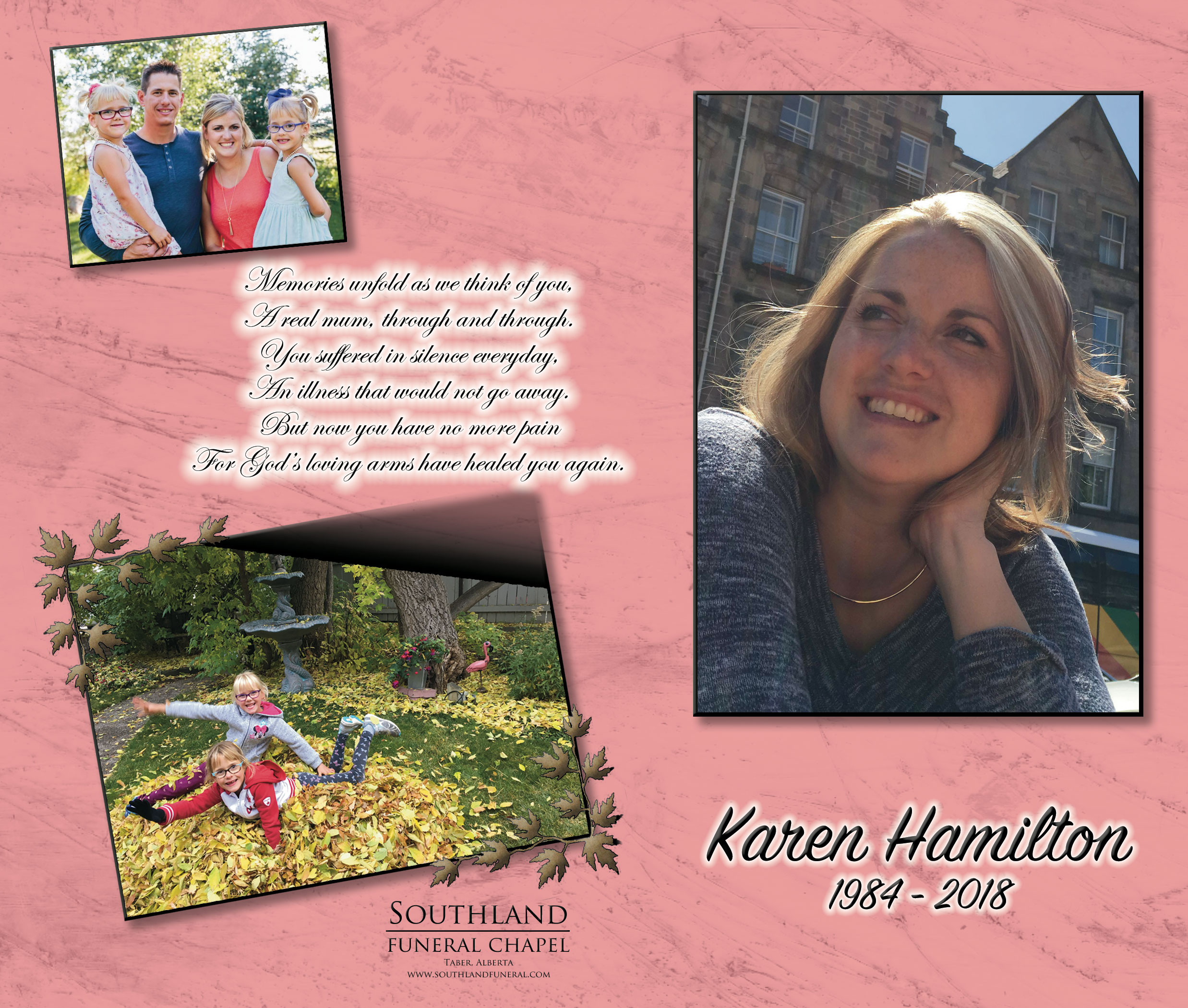 Karen will be forever loved and missed by her dear husband Brent and their daughters Emma and Lily. She will also be lovingly remembered by her parents Henk and Janny DeVlieger of Taber; her brother Sam (Lesley) DeVlieger of Taber and their family Branson and Barrett and her brother Marten (Janine) DeVlieger of Taber and their family Noah and Kabrina. Karen will also be dearly missed by Brent's family including his parents Tom and Rita Hamilton of Medicine Hat; his grandpa Charlie Schramm of Sparwood; his brother Brad (Ashley) Hamilton of Airdrie and their family Blake, Alya and Elliya, his brother Kevin (Lisa) Hamilton of Medicine Hat and their daughter Khloe and his sister Kelly (Cole) Penner of Medicine Hat and their daughter Mackinley.