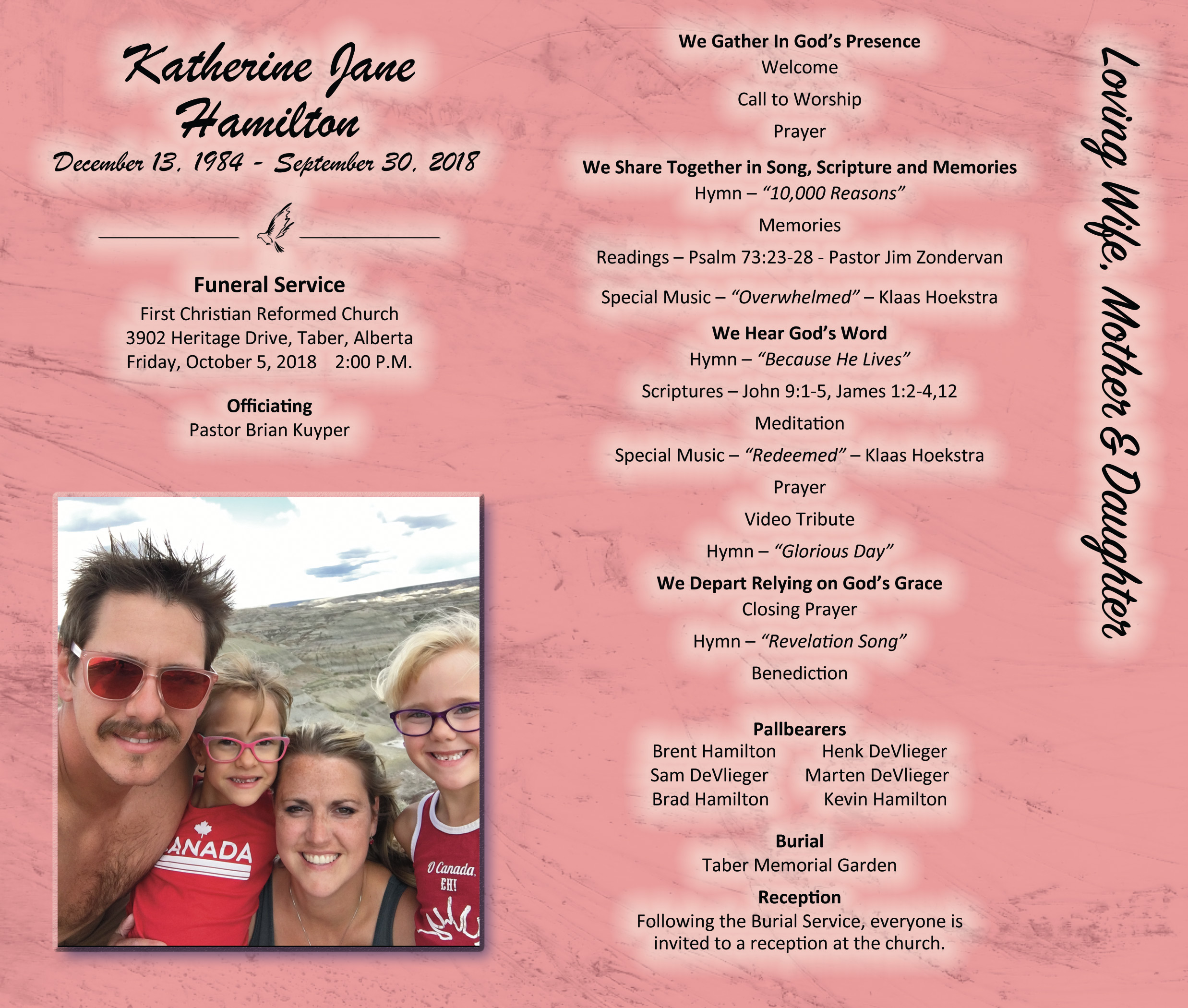 The Funeral Service was held at the First Christian Reformed Church, 3902 Heritage Drive, Taber on Friday, October 5, 2018 at 2:00 P.M. Burial followed at the Taber Memorial Garden.