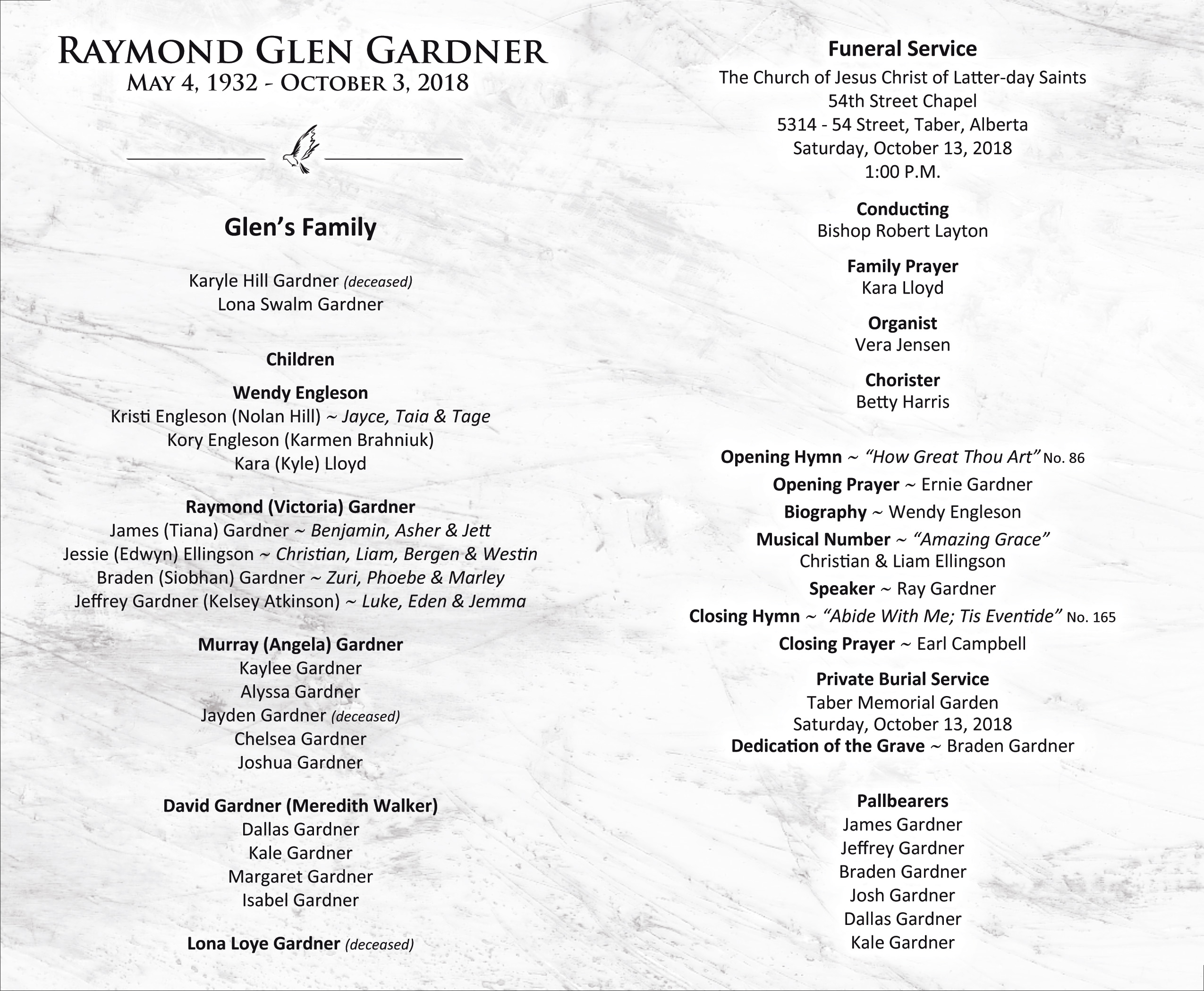 The Funeral Service was held at The Church of Jesus Christ of Latter-day Saints, 54th Street Chapel, 5314 - 54 Street, Taber on Saturday, October 13, 2018 at 1:00 P.M.