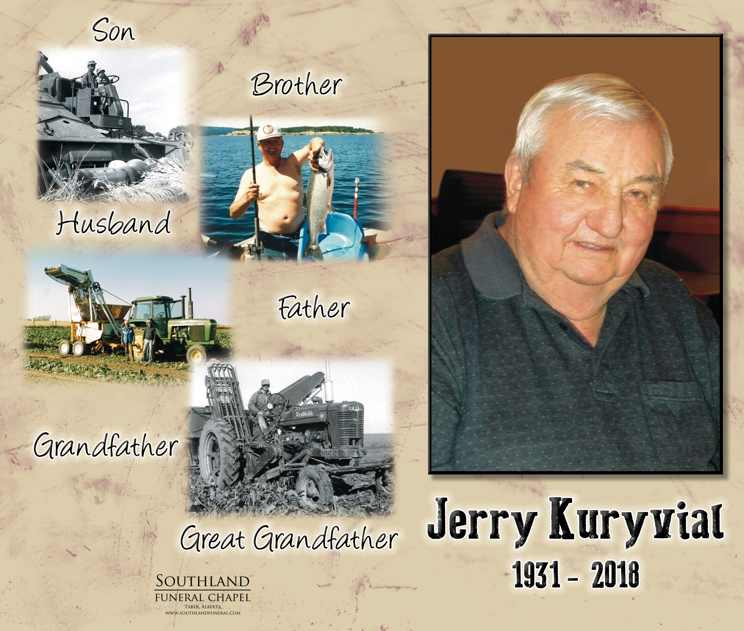 Jerry is survived by his wife Tess; children Darrell (Joanne) Kuryvial of Taber, Randall (Michelle) Kuryvial of Victoria, British Columbia, Mark (Kori) Kuryvial of Cranford, Michele (Shane) Garford of Stony Plain and Trevor (Jacquie) Kuryvial of Shuswap Lake, British Columbia; fifteen grandchildren and twelve great grandchildren. He is also survived by his brother Miles (Doreen) Kuryvial and brother-in-law Gaston (Lillian) Tessier.