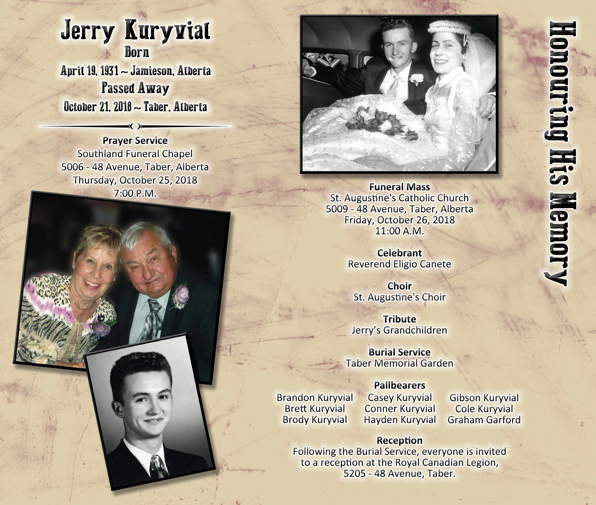 The Funeral Mass was be celebrated at St. Augustine's Catholic Church, 5009 - 48 Avenue, Taber on Friday, October 26, 2018 at 11:00 A.M. Burial followed at the Taber Memorial Garden.