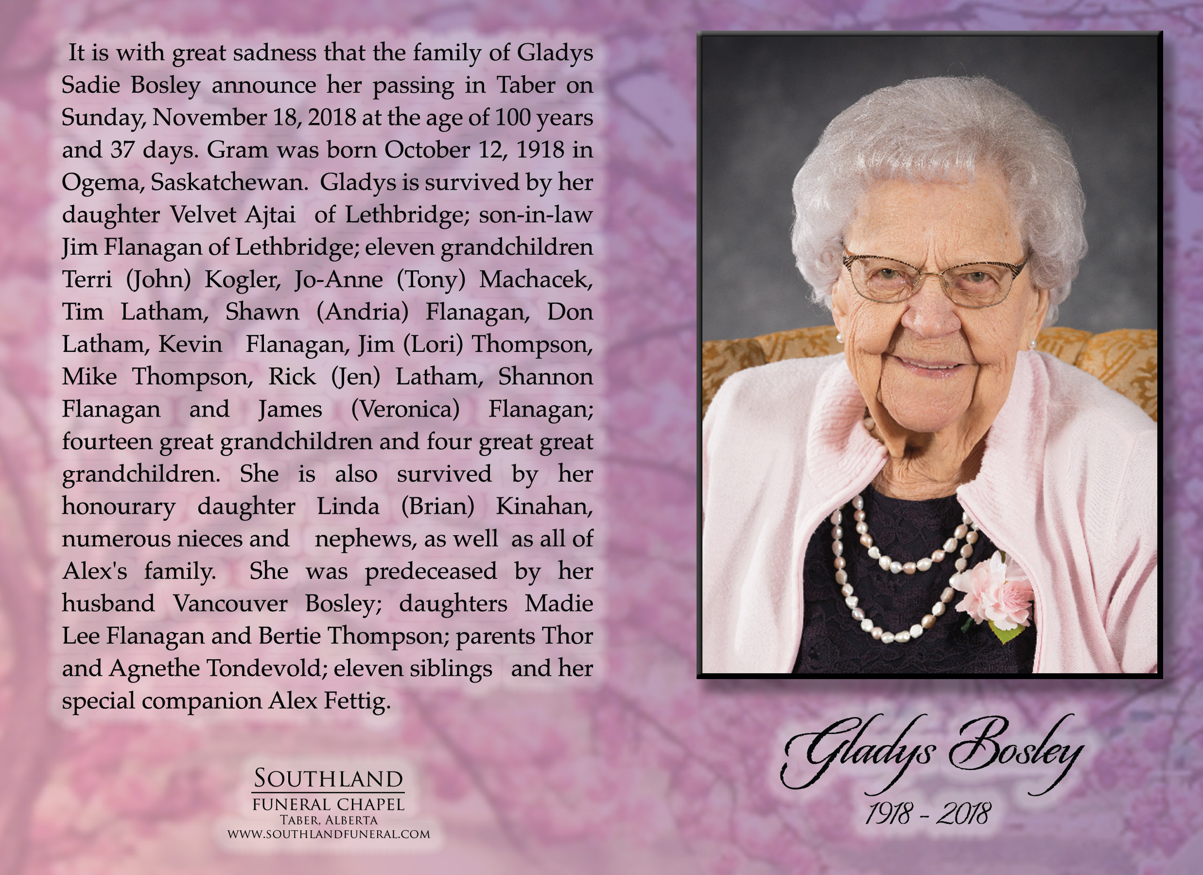 It is with great sadness that the family of Gladys Sadie Bosley announce her passing in Taber on Sunday, November 18, 2018 at the age of 100 years and 37 days. Gram was born October 12, 1918 in Ogema, Saskatchewan.