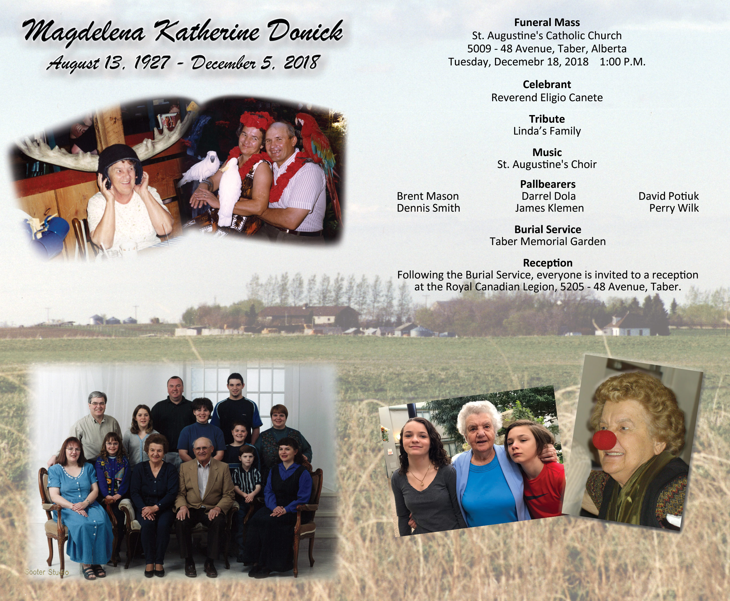 Magdelena Katherine Donick, beloved wife of the late Nick Donick, passed away in Lethbridge on Wednesday, December 5, 2018 at the age of 91 years.