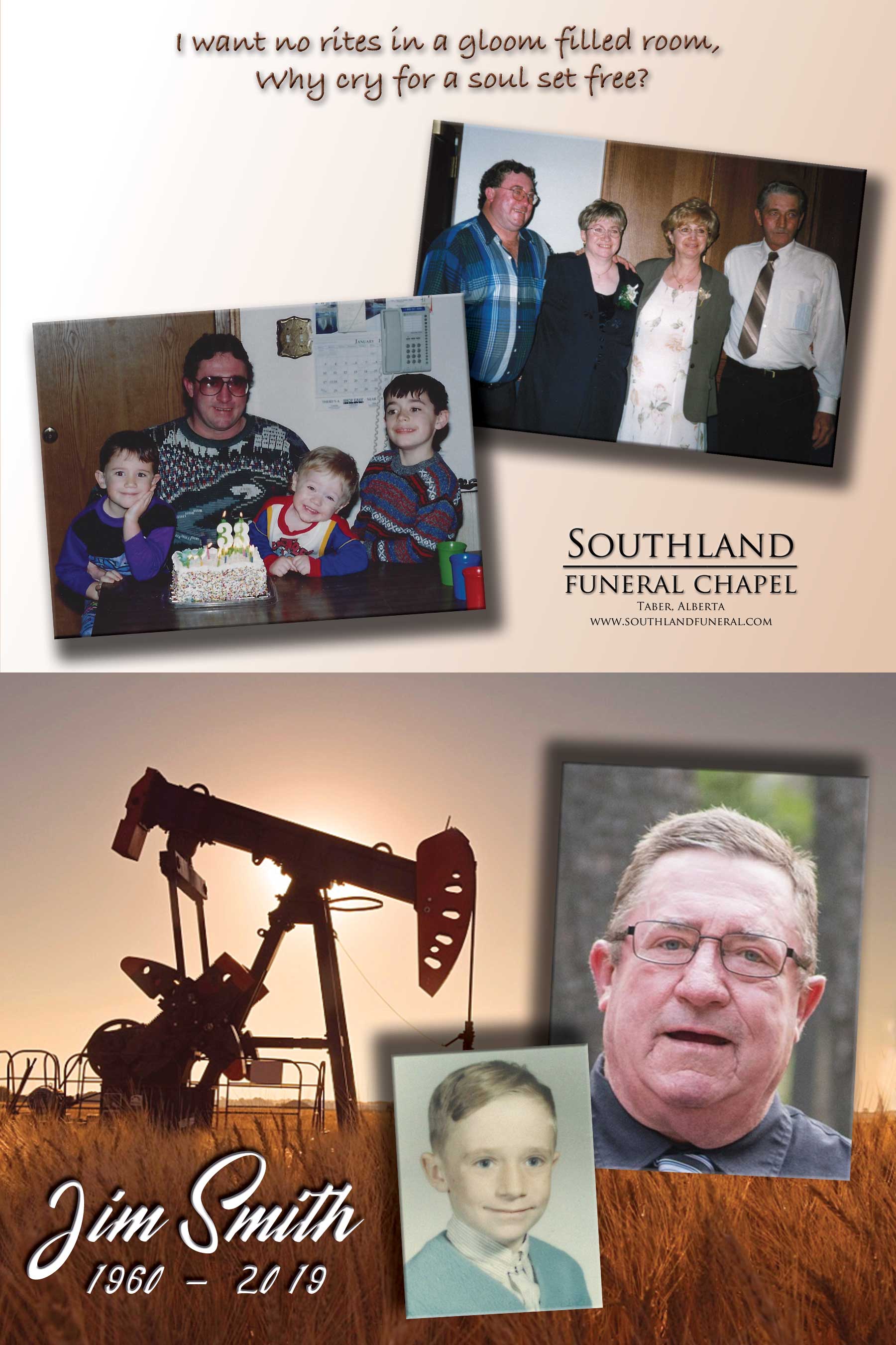 Jim is survived by his sons Josh (Bobbi-Jo) Smith of Shaunavon, Saskatchewan, Jared (Alyson) Smith of Cold Lake and Jesse (Rebecca) Smith of Lethbridge; grandchildren Jordan, Kyle and Carson Smith. He is also survived by his siblings Marilyne Smith (Monti Maxwell) and Bonnie (Barry) Daisley; sister-in-law Violet Smith as well as numerous nieces and nephews.