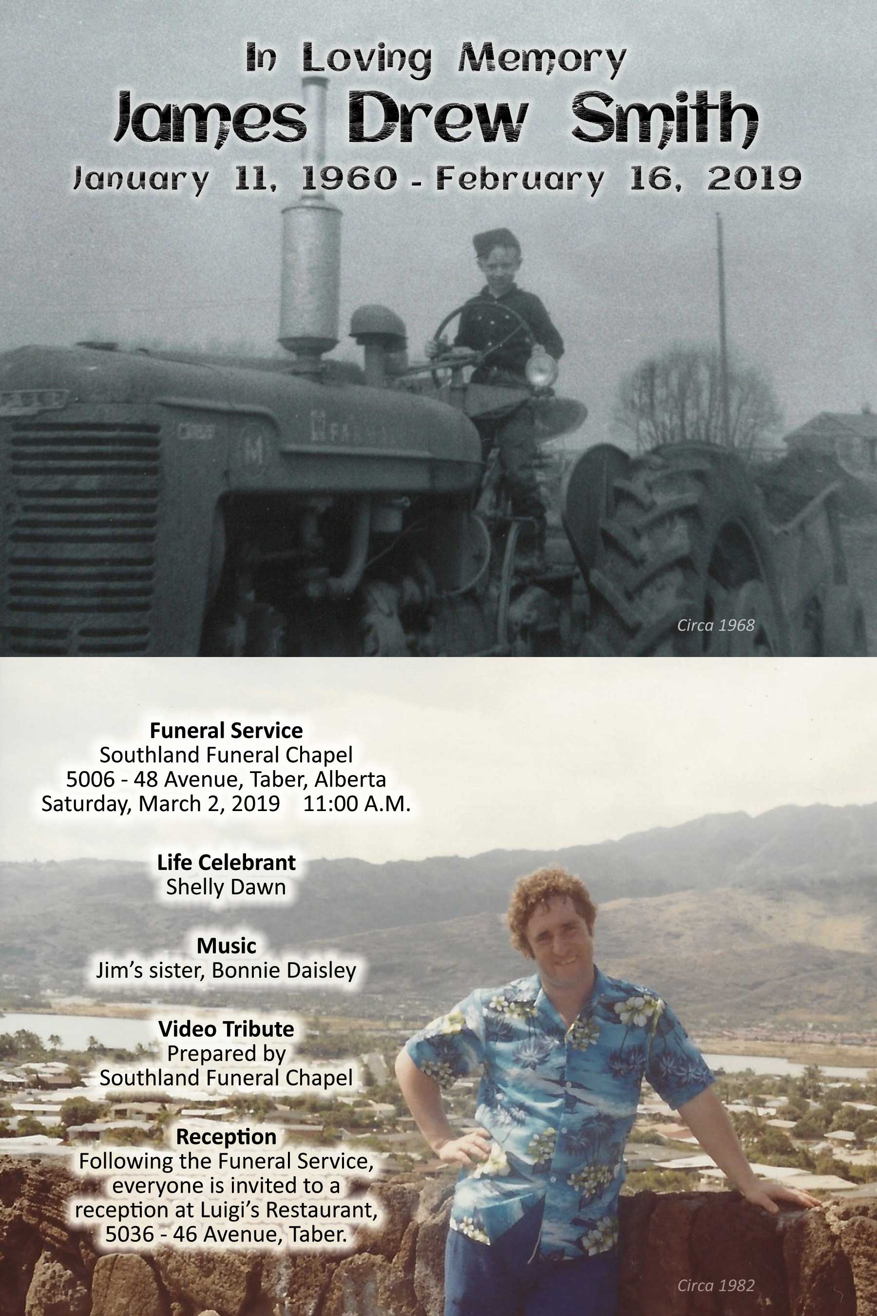 James Drew Smith, passed away on Saturday, February 16, 2019 at the age of 59 years. Jim spent his final days surrounded by family at the Peter Lougheed Centre in Calgary.