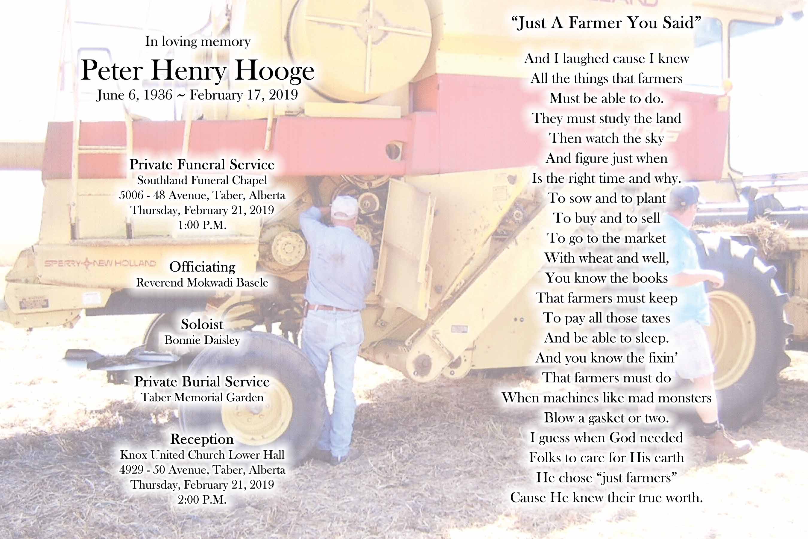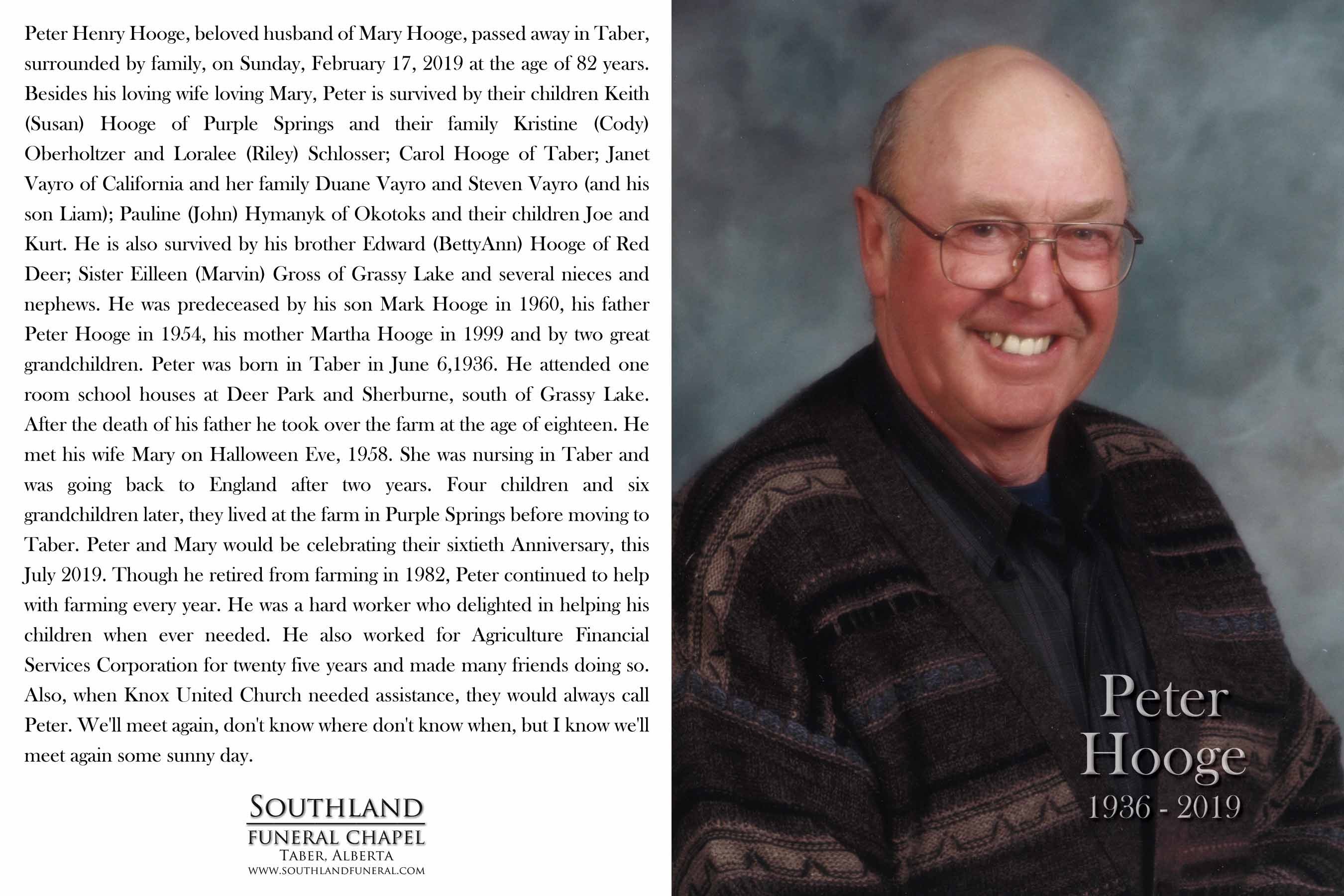 Peter Henry Hooge, beloved husband of Mary Hooge, passed away in Taber, surrounded by family, on Sunday, February 17, 2019 at the age of 82 years.
