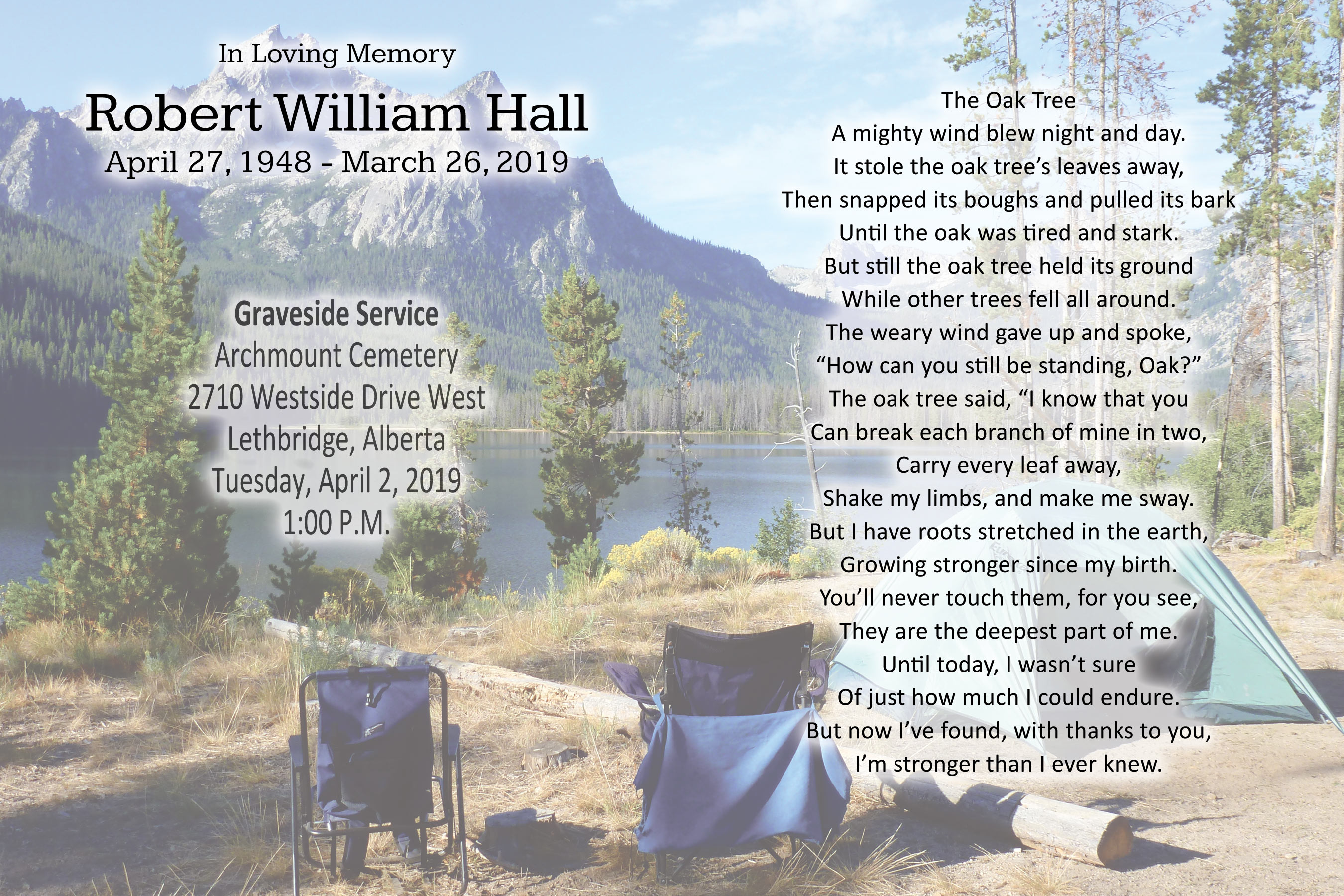The Burial Service was held at Archmount Cemetery, 2710 Westside Drive West, Lethbridge on Tuesday, April 2, 2019 at 1:00 P.M.