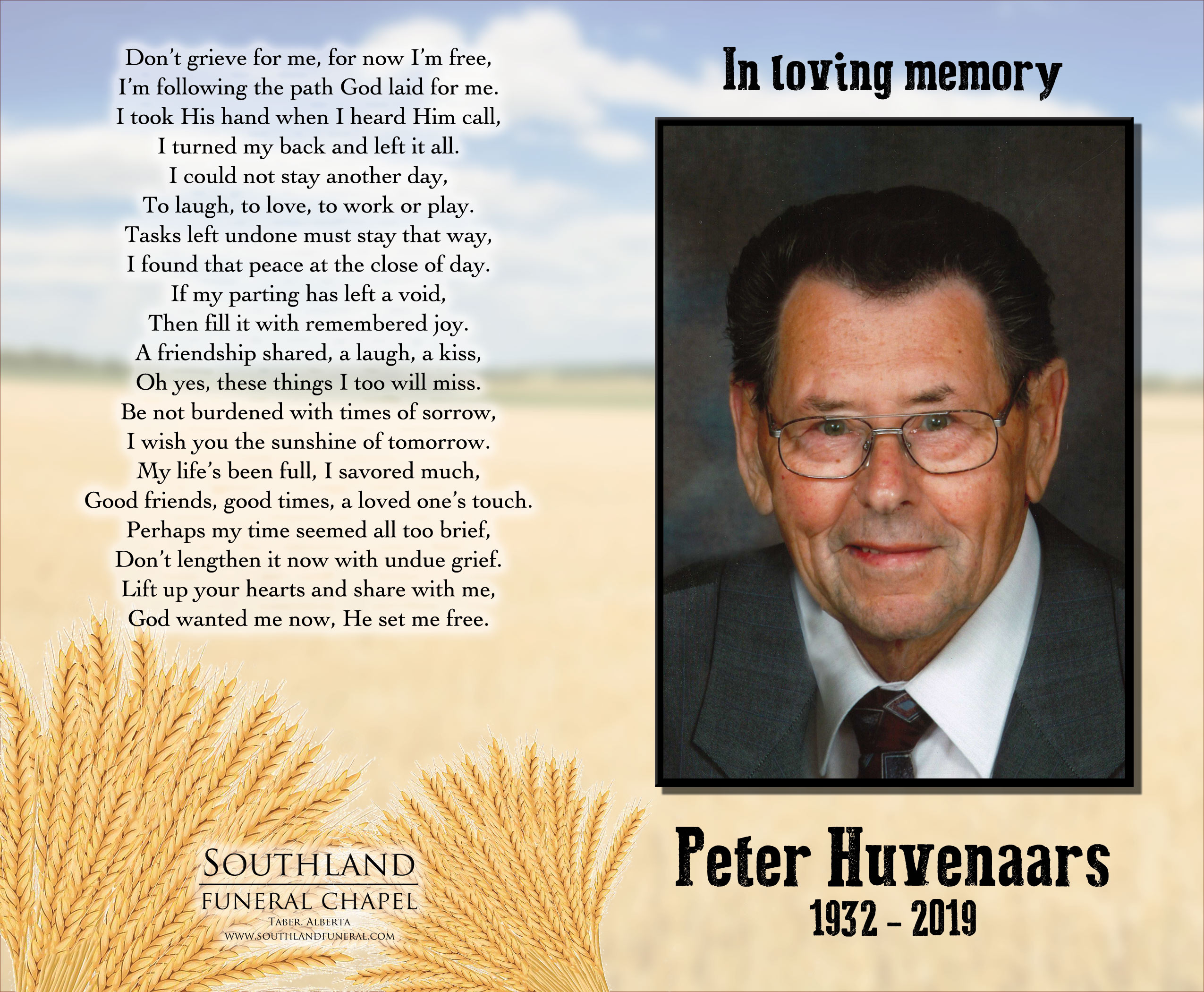 Our family sadly announces the passing of our beloved dad, Peter Huvenaars, who passed away unexpectedly, but peacefully, in his sleep at his home in Taber on Saturday, April 13, 2019 at the age of 86 years.