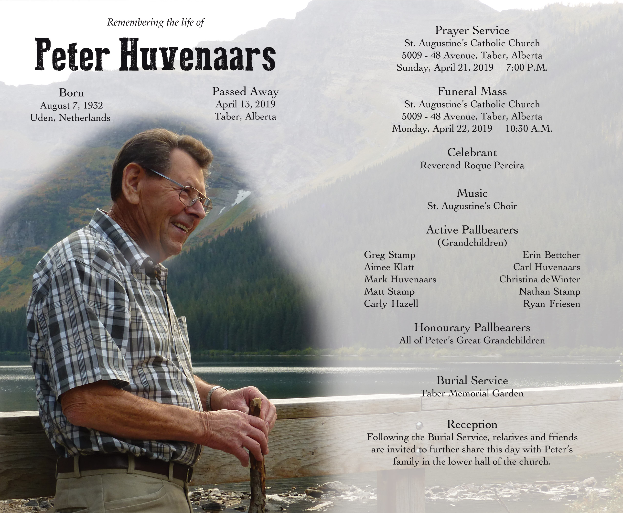 The Funeral Mass was celebrated at St. Augustine's Catholic Church, 5009 - 48 Avenue, Taber on Monday, April 22, 2019 at 10:30 A.M. Burial followed at the Taber Memorial Garden.