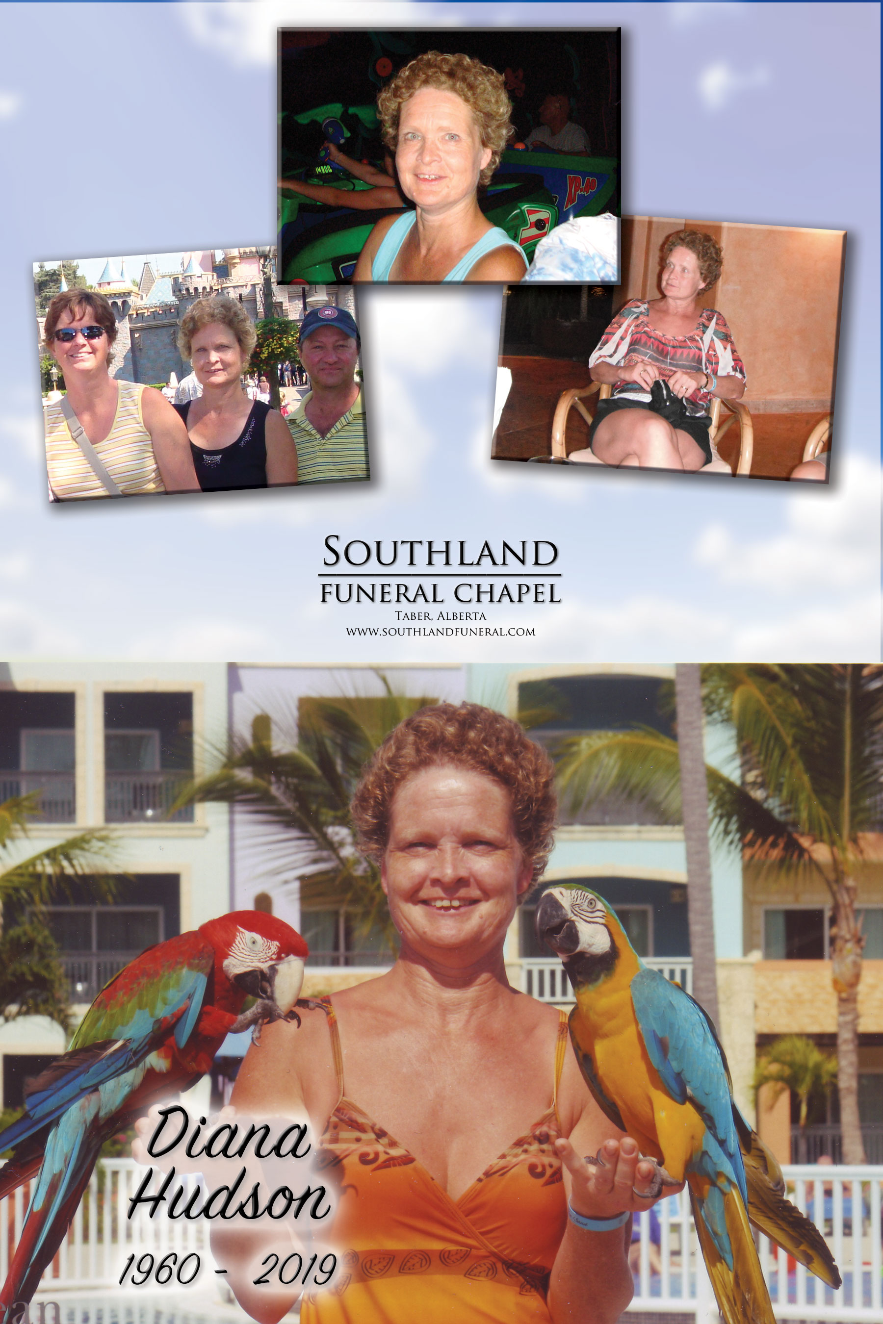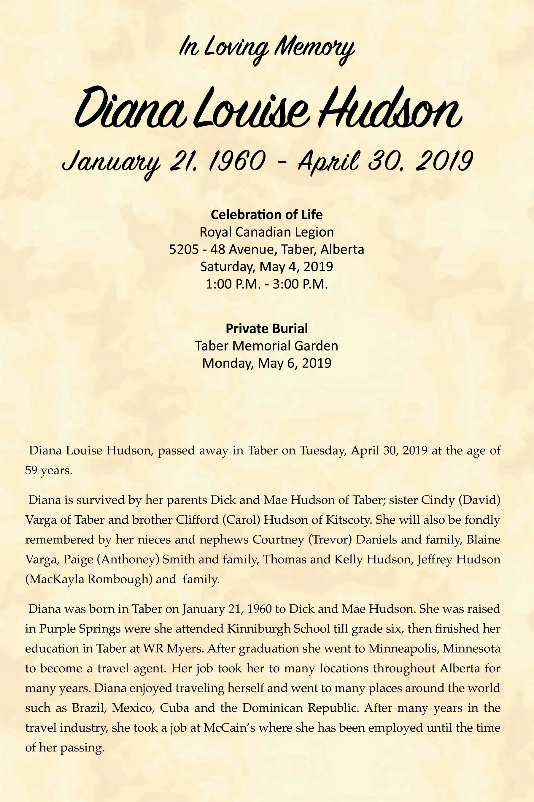 Diana is survived by her parents Dick and Mae Hudson of Taber; sister Cindy (David) Varga of Taber and brother Clifford (Carol) Hudson of Kitscoty. She will also be fondly remembered by her nieces and nephews Courtney (Trevor) Daniels and family, Blaine Varga, Paige (Anthoney) Smith and family, Thomas and Kelly Hudson, Jeffrey Hudson (MacKayla Rombough) and family.