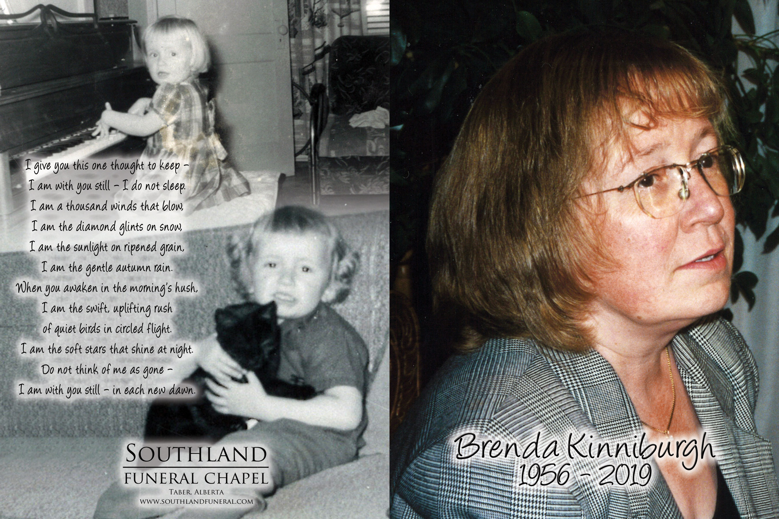 It is with great sadness that the family of Brenda Jean Kinniburgh, beloved wife of Tom Kinniburgh, announce her passing in Taber on Thursday, May 2, 2019 at the age of 62 years.