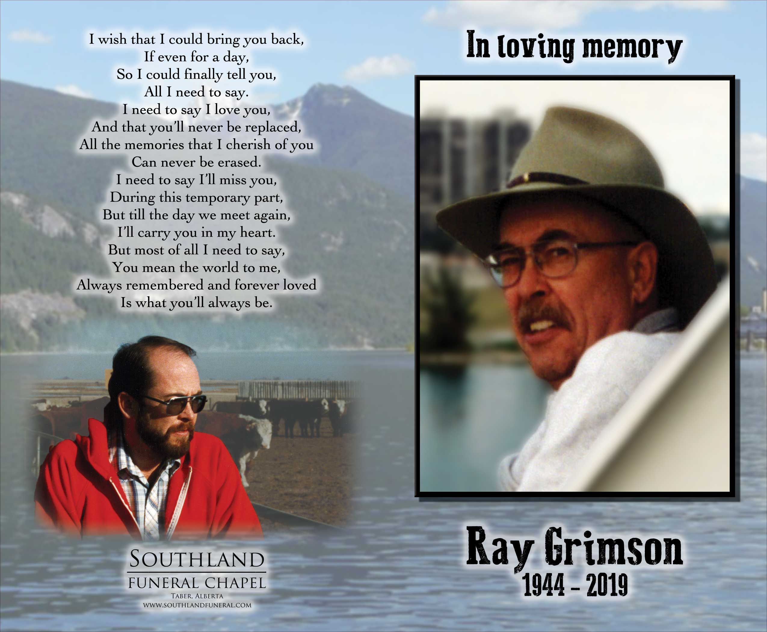 Besides his loving wife Alexis, Ray is survived by his sons Gavin (Angelina) Grimson of Calgary and their children Alissa and Austin; Corby (Terri) Grimson of Taber and their children Erik and Jayna; sisters Marilyn (Ernie) Rowein of Sundre and Gail Grimson of Sylvan Lake as well as numerous brothers in-law, sisters in-law, nieces, nephews and cousins.