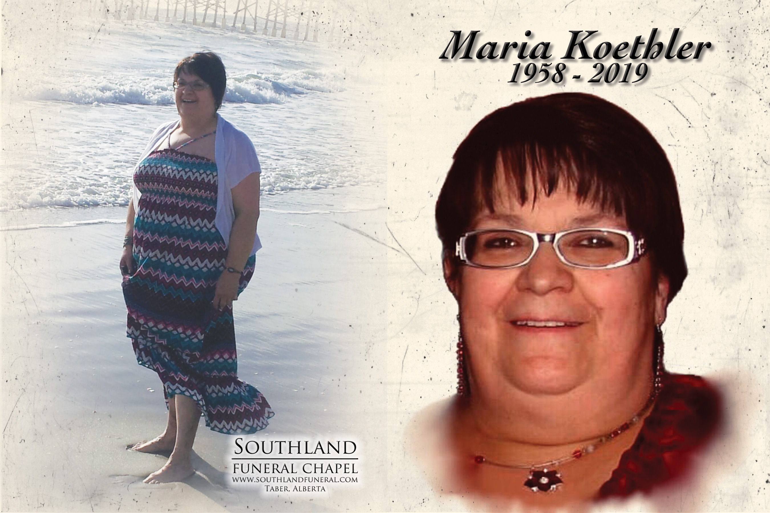 It is with great sadness yet rejoicing that the family of Maria Koethler announce her passing. She went home to be with her Lord and Saviour, Jesus Christ on Wednesday, August 21, 2019 at the age of 61 years.